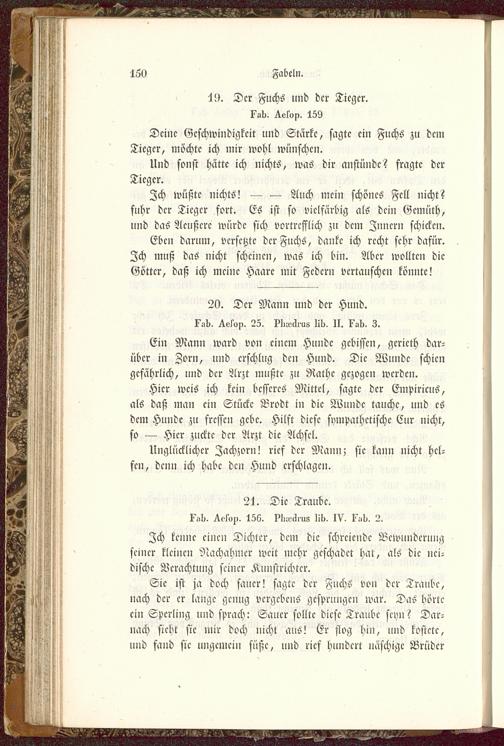 Sie ist ja doch sauer! sagte dcr Fuchs von dcr Traubc,nach dcr cr lange gcnug vergebens gesprungen war. Das hörtecin Sperling und sprach: Sauer sollte dicsc Traubc scyn? Dar-nach ficht sie mir doch nicht aus! Er flog hin, und kostete,und fand sie ungcmcin süßc, und ricf hundert näschigc Brüder