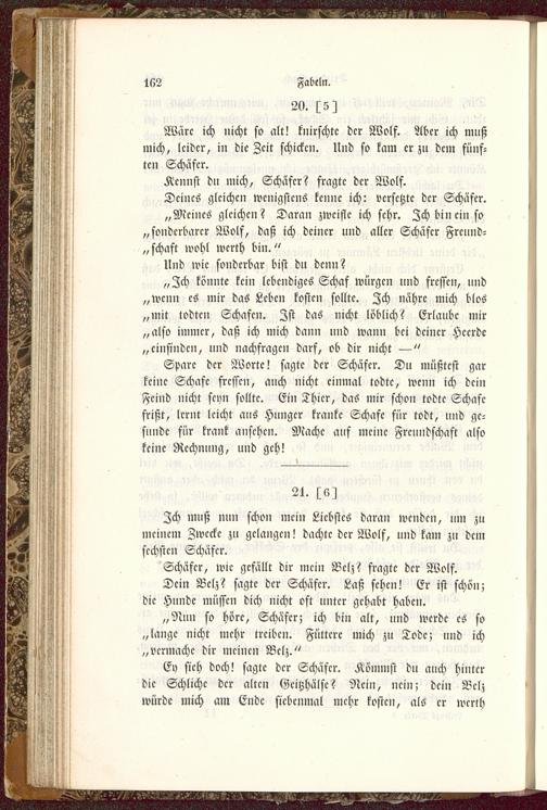 Spare dcr Worte! sagte der Schäfer. Du müßtest garkeine Schafe frcsscn, auch nicht einmal todte, wenn ich deinFeind nicht seyn sollte. Ein Thier, das mir schon todtc Schafefrißt, lernt leicht ans Hunger kranke Schafe für todt, und ge-sunde für krank ansehen. Mache auf meine Freundschaft alsokeine Rechnung, und geh!