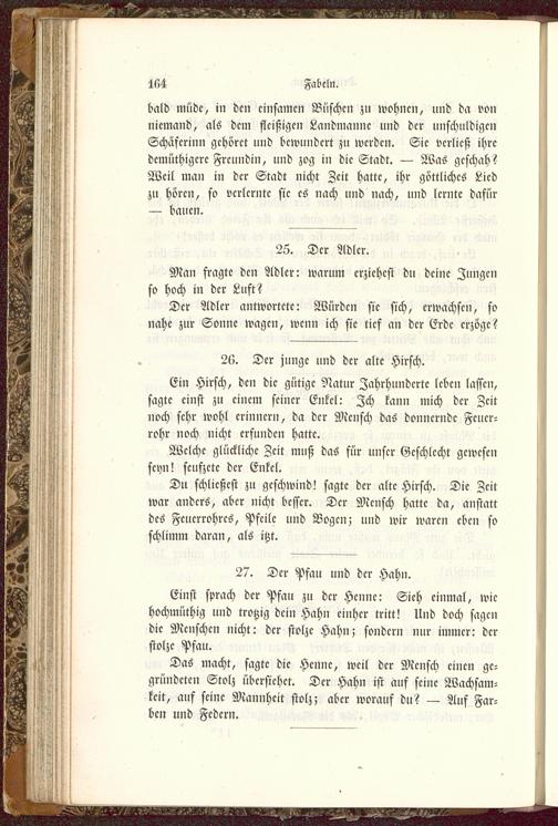 Einst sprach der Pfau zu der Henne: Sich einmal, wiehochmüthig und trotzig dein Hahn einher tritt! Und doch sagendie Menschen nicht: der stolze Hahn; sondern nur immer: derstolze Pfau.