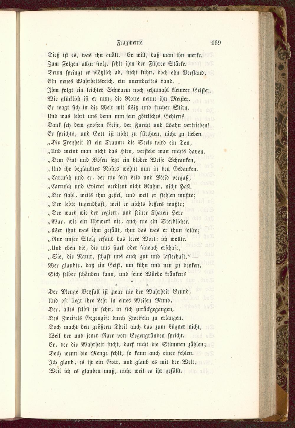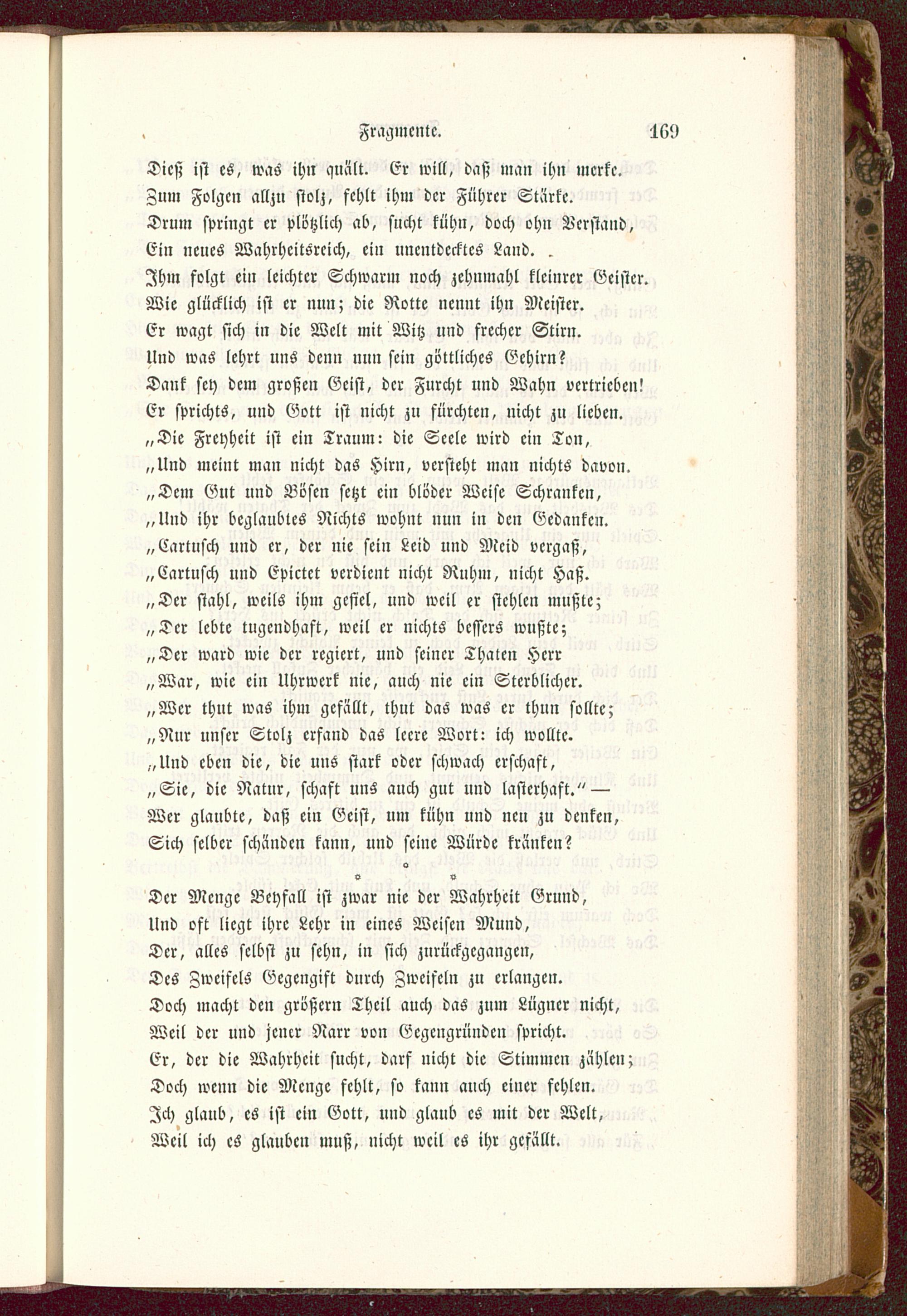 Der Menge Beyfall ist zwar nie der Wahrheit Grund,Und oft liegt ihre Lehr in eines Weisen Mund,Der, alles selbst zu sehn, in sich zurückgegangen,Des Zweifels Gegengift durch Zweifeln zn erlangen.Doch macht den größer» Theil auch das zum Lügner nicht,Weil der und jener Narr von Ecgcngründcn spricht.Er, der die Wahrheit sucht, darf nicht die Stimmen zählen;Doch wenn die Menge fehlt, so kann auch einer fehlen.Ich glaub, es ist ein Gott, und glaub es mit der Welt,Weil ich es glauben muß, nicht weil es ihr gefällt.