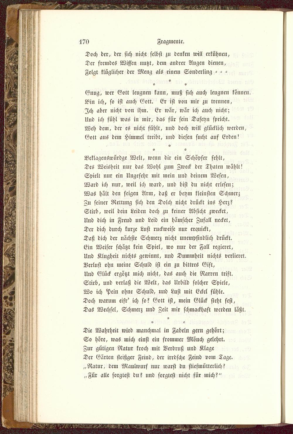 Gnug, wer Gott leugnen kann, muß sich auch leugnen können.Bin ich, so ist auch Gott, Er ist von mir zu trennen,Ich aber nicht von ihm. Er wär, wär ich auch nicht;Und ich suhl was in mir, das für sein Daseyn spricht.Weh dem, der es nicht fühlt, und doch will glücklich werden,Gott aus dem Himmel treibt, und diesen sucht auf Erden!