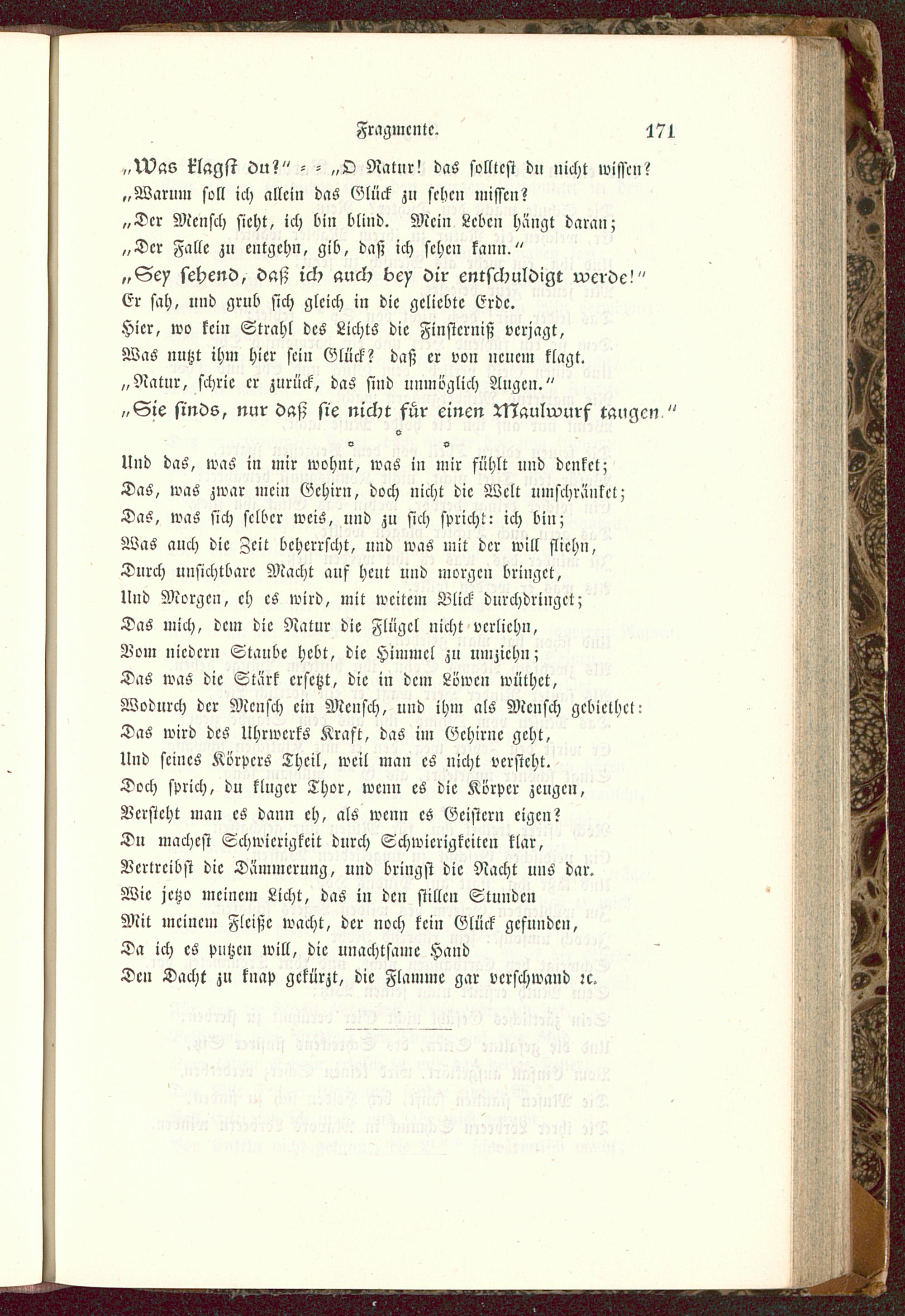 Und das, was in mir wohnt, was in mir fühlt und denket;Das, was zwar mein Gehirn, doch nicht die Welt umschränkct;Das, was sich selber weis, und zu sich spricht: ich bin;Was auch die Zeit beherrscht, und was mit der will slichn,Durch unsichtbare Macht auf hcnt und morgen bringet,lind Morgen, ch cS wird, mit weitem Wlick dnrchdringet;Das mich, dem die Natur die Flügel nicht verlieh»,Vom niedern Staube hebt, die Himmel zn umzichn;Das was die Stärk ersetzt, die in dem Lvwcn wüthet,Wodurch der Mensch ein Mensch, und ihm als Mensch gebiethet:Das wird des Uhrwerks Kraft, das im Gehirne geht,lind seines Körpers Theil, weil man cS nicht versteht.Doch sprich, du kluger Thor, wenn es die Körper zeugen,Versteht man cS dann ch, als wenn es Geistern eigen?Du machest Schwierigkeit durch Schwierigkeiten klar,Vertreibst die Dämmerung, und bringst die Nacht uuS dar.Wie jctzo meinem Licht, das in den stillen StundenMit meinem Fleiße wacht, der noch kein Glück gesunde»,Da ich es putze» will, die »»achtsame HandDen Dacht zu knav gekürzt, die Flamme gar verschwand :c.