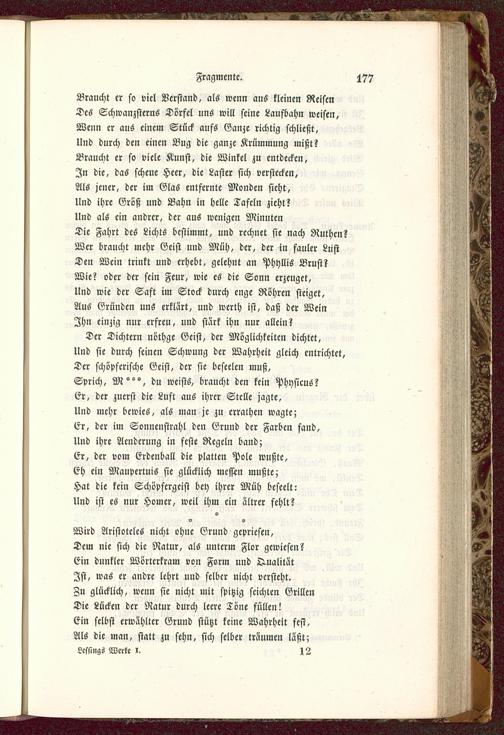 Wird Aristoteles nicht ohne Grund gepriesen,Dem nie sich die Natur, als unterm Flor gewiesen?Ei» dunkler Wörterkram von Form und O-ualitätIst, was er andre lehrt und selber nicht versteht.Zu glücklich, wenn sie nicht mit spitzig seichten GrillenDie Lücken der Natur durch leere Töne füllen!Ein selbst erwählter Grund stützt keine Wahrheit fest.Als die man, statt zu sehn, sich selber träumen läßt;Leslings Werke I. 12