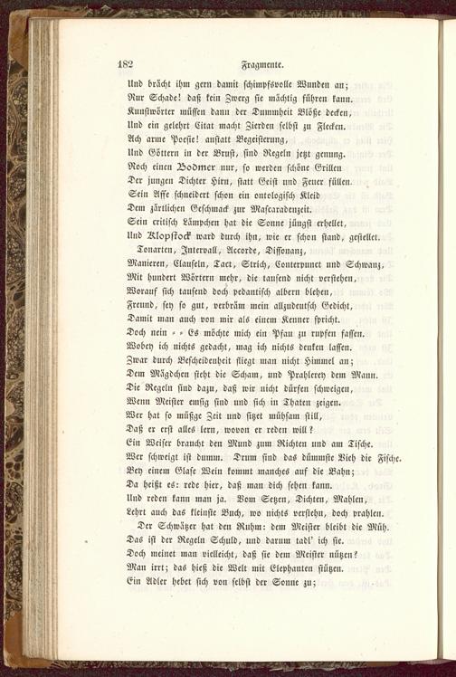 Tonarten, Intervall, Accorde, Dissonanz,Manieren, Clauseln, Tact, Strich, Conterpunct und Schwanz,Mit hundert Wörtern mehr, die tausend nicht verstehen,Worauf sich tausend doch pedantisch albern blehen,Freund, sey so gut, verbräm mein allzudeutsch Gedicht,Damit man auch von mir als einem Kenner spricht.Doch nein - - Ss möchte mich ein Pfau zu rupfen fassen.Wobey ich nichts gedacht, mag ich nichts denken lassen.Zwar durch Bescheidenheit fliegt man nicht Himmel an;Dem Magdchcn steht die Scham, und Prahlercy dem Manu.Die Regeln sind dazu, daß wir nicht dürfen schweigen,Wenn Meister emsig sind und sich in Thaten zeigen.Wer hat so müßge Zeit und sitzet mühsam still,Daß er erst alles lern, wovon er reden will?Ein Weiser braucht den Mund zum Richten und am Tische.Wer schweigt ist dumm. Drum sind das dümmste Lieh die Fische.Bey einem Glase Wein kommt manches auf die Bahn;Da heißt es: rede hier, daß man dich sehen kann.Und reden kann man ja. Vom Setzen, Dichten, Mahlen,Lehrt auch das kleinste Buch, wo nichts verstehn, doch prahlen.