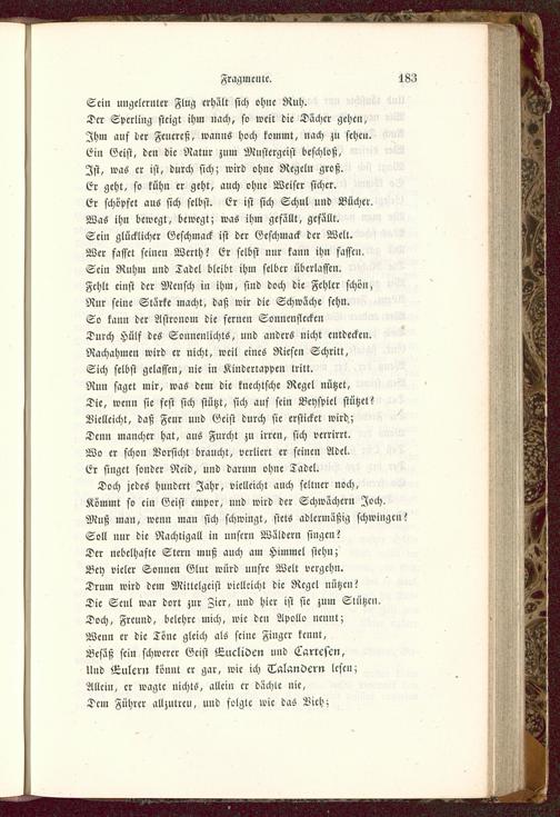 Sei» uugclcrulcr Flug erhält sich ohne Ruh.Der Sperling steigt ihm nach, so weit die Dächer gehe»,Ihm auf der Feuercß, wa»»S hoch kommt, nach zu scheu.Ein Geist, den die Natur zum Mustergcist beschloß,Ist, was er ist, durch sich; wird ohne Regeln groß.Er geht, so kühn er geht, auch ohne Weiser sicher.Er schöpfet aus sich selbst. Er ist sich Schul und Bücher.Was ihn bewegt, bewegt; was ihm gefällt, gefällt.Sem glücklicher Geschmack ist der Geschmack der Welt.Wer fasset scincu Werth? Er selbst nur kann ihn fasse».Sein Ruhm und Tadel bleibt ihm selber überlassen.Fehlt einst der Mensch in ihm, sind doch die Fehler schon,Nur seine Stärke macht, daß wir die Schwäche sehn.So kann der Astronom die fernen SouiicnflcckcnDurch Hülf des Sonnenlichts, und anders nicht entdecken.Nachahmen wird er nicht, weil eines Riesen Schritt,Sich selbst gelassen, nie in Kindenappeu tritt.Nun saget mir, was dem die knechtsche Regel nützet,Die, wenn sie fest sich stützt, sich auf scin Beyspiel stützet?Vielleicht, daß Fcur und Geist durch sie ersticket wird.;Denn mancher hat, aus Furcht zu irren, sich verrirrt.Wo cr schon Vorsicht braucht, verliert er seinen Adel.Er singet sonder Neid, und darum ohne Tadel.