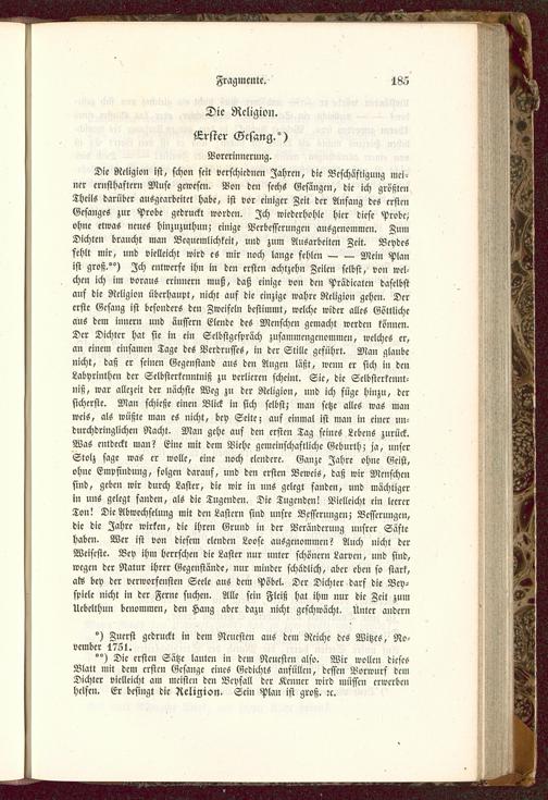 Die Religion ist, schon seit vcrschicdncn Jahren, die Beschäftigung mei-ner ernsthafter» Mnse gewesen. Von den sechs Gesängen, die ich größtenTheils darüber ausgearbeitet habe, ist vor einiger Zeit der Anfang des erstenGesanges zur Probe gedruckt worden. Ich wicdcrhohlc hier diese Probe/ohne etwas neues hinzuzuthun; einige Verbesserungen ausgenommen. JuniDichten braucht man Bequemlichkeit, uud zum Ausarbeiten Zeit. Beydes