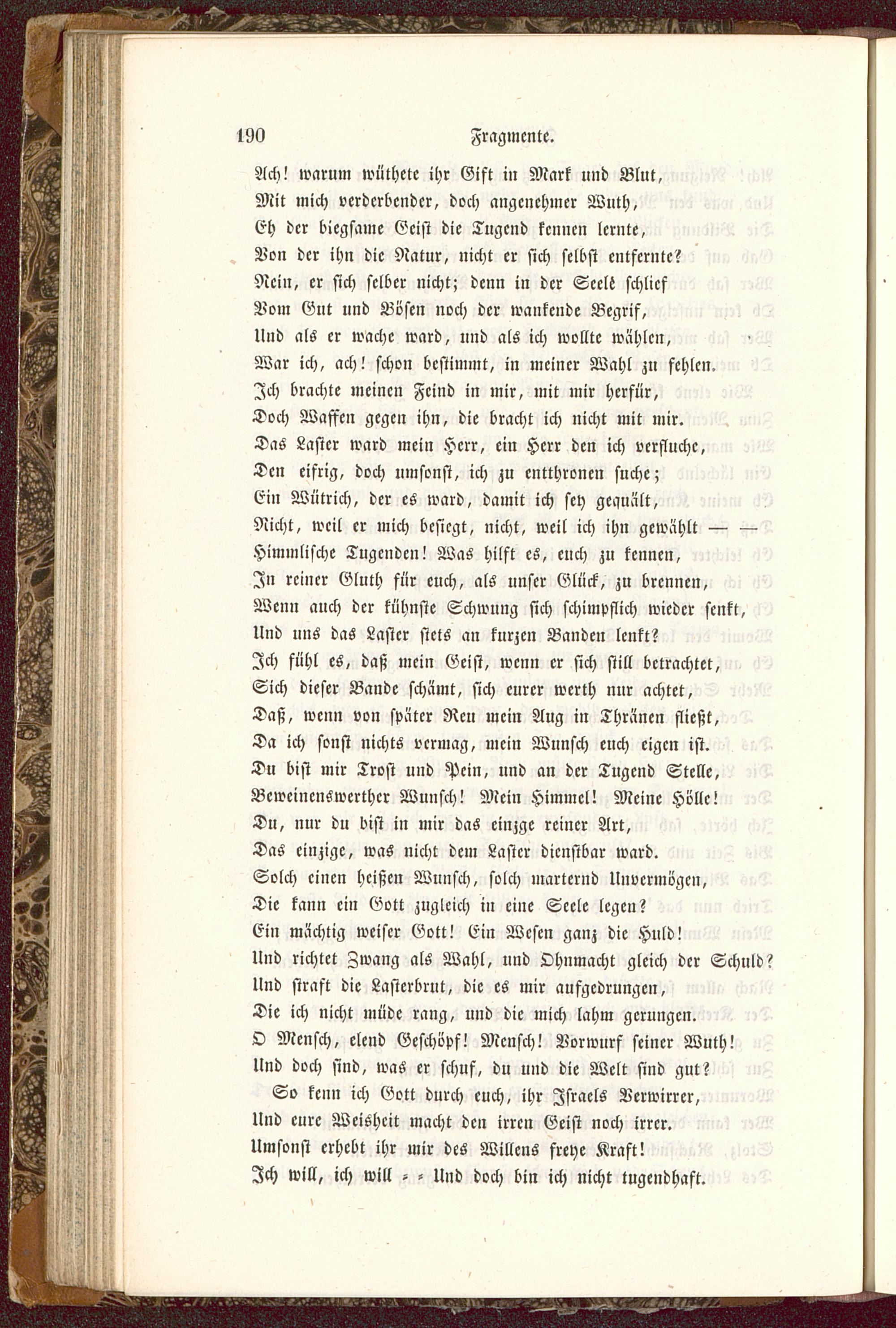 Ach! warum wüthete ihr Gift in Mark und Blut,Mit mich verderbender, doch angenehmer Wuth,Eh der biegsame Geist die Tugend kennen lernte,Von der ihn die Natur, nicht er sich selbst entfernte?Nein, er sich selber nicht; denn in der Seele schliefVom Gnt und Bösen noch der wankende Begrif,Und als er wache ward, und als ich wollte wählen,War ich, ach! schon bestimmt, in meiner Wahl zu fehlen.Ich brachte meinen Feind in mir, mit mir hcrfür,Doch Waffen gegen ihn, die bracht ich nicht mit mir.Das Laster ward mein Herr, ein Herr den ich verfluche,Den eifrig, doch umsonst, ich zu entthronen suche;Ein Wütrich, der es ward, damit ich sey gequält,