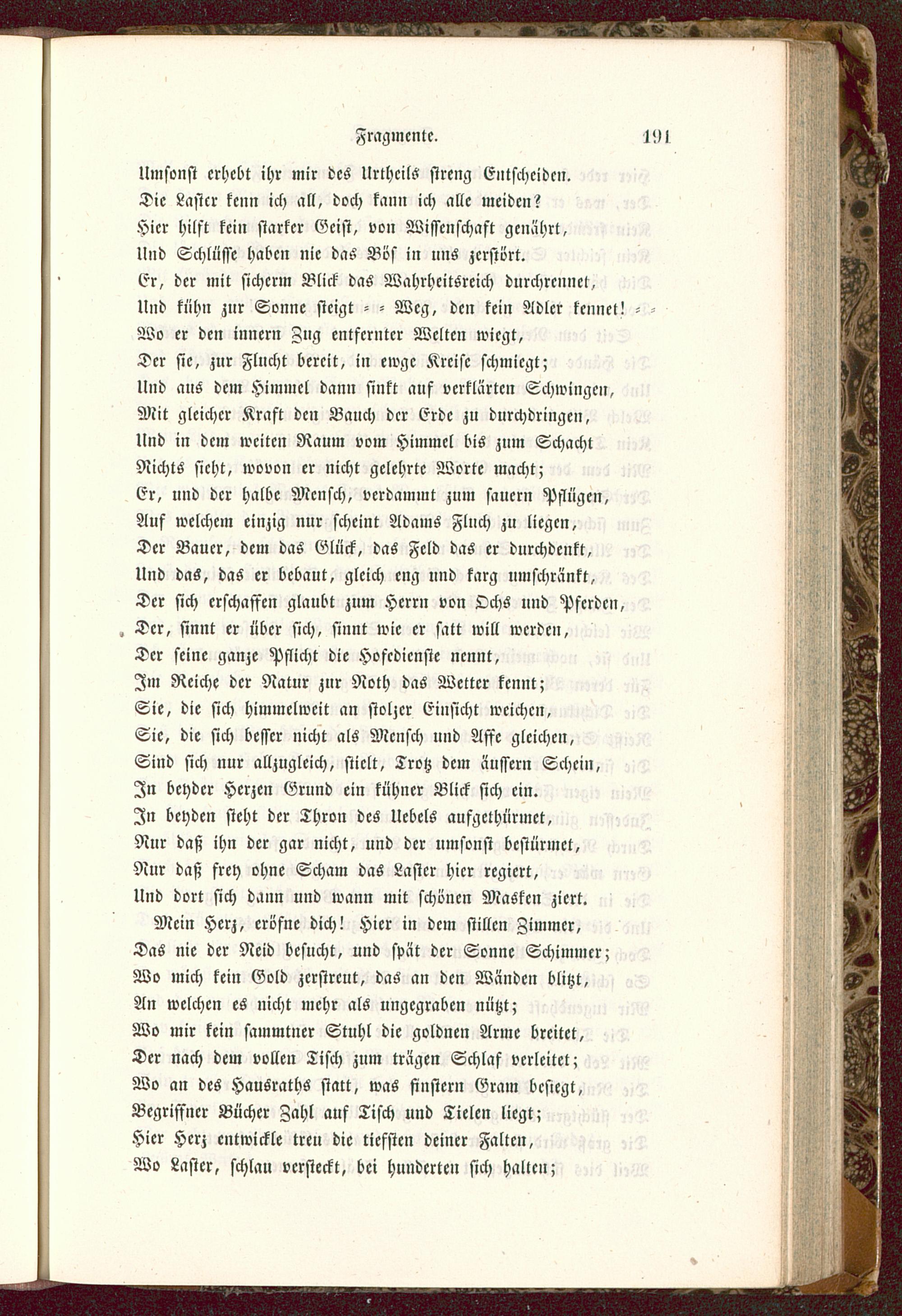 Umsonst erhebt ihr mir des Urtheils streng Entscheiden.Die Laster kenn ich all, doch kann ich alle meiden?Hier hilft kein starker Geist, von Wissenschaft genährt,Und Schlüsse haben nie das Bös in uns zerstört.Er, der mit sicherm Blick das WahrhcitSreich durchrennet,Und kühn zur Sonne steigt - - Weg, den kein Adler keimet!Wo er den innern Fug entfernter Welten wiegt,Der sie, zur Flucht bereit, in cwgc Kreise schmiegt;Und aus dem Himmel dann sinkt auf verklärten Schwingen,Mit gleicher Kraft den Bauch der Erde zu durchdringen,Und in dem weiten Raum vom Himmel bis zum SchachtNichts sieht, wovon er nicht gelehrte Worte macht;Er, und der halbe Mensch, verdammt zum sauern Pflügen,Auf welchem einzig nur scheint Adams Fluch zu liegen.Der Bauer, dem das Glück, das Feld das er durchdenkt,Und das, daS er bebaut, gleich eng und karg umschränkt,Der sich erschaffen glaubt zum Herrn von OchS und Pferden,, Der, sinnt er über sich, sinnt wie er satt will werden,Der seine ganze Pflicht die Hofcdicnste nennt,Im Reiche der Natur zur Noth daS Wetter kennt;Sie, die sich himmelweit an stolzer Einsicht weichen,Sie, die sich besser nicht als Mensch und Affe gleichen,Sind sich nur allzugleich, stielt, Trotz dem äusser» Schein,In beyder Herzen Grund ein kühner Blick sich ein.In beyden steht der Thron des Uebels aufgcthürmet,Nur daß ihn der gar nicht, und der umsonst bestürmet,Nur daß frey ohne Schani das Laster hier regiert,Und dort sich dann und wann mit schonen Masken ziert.