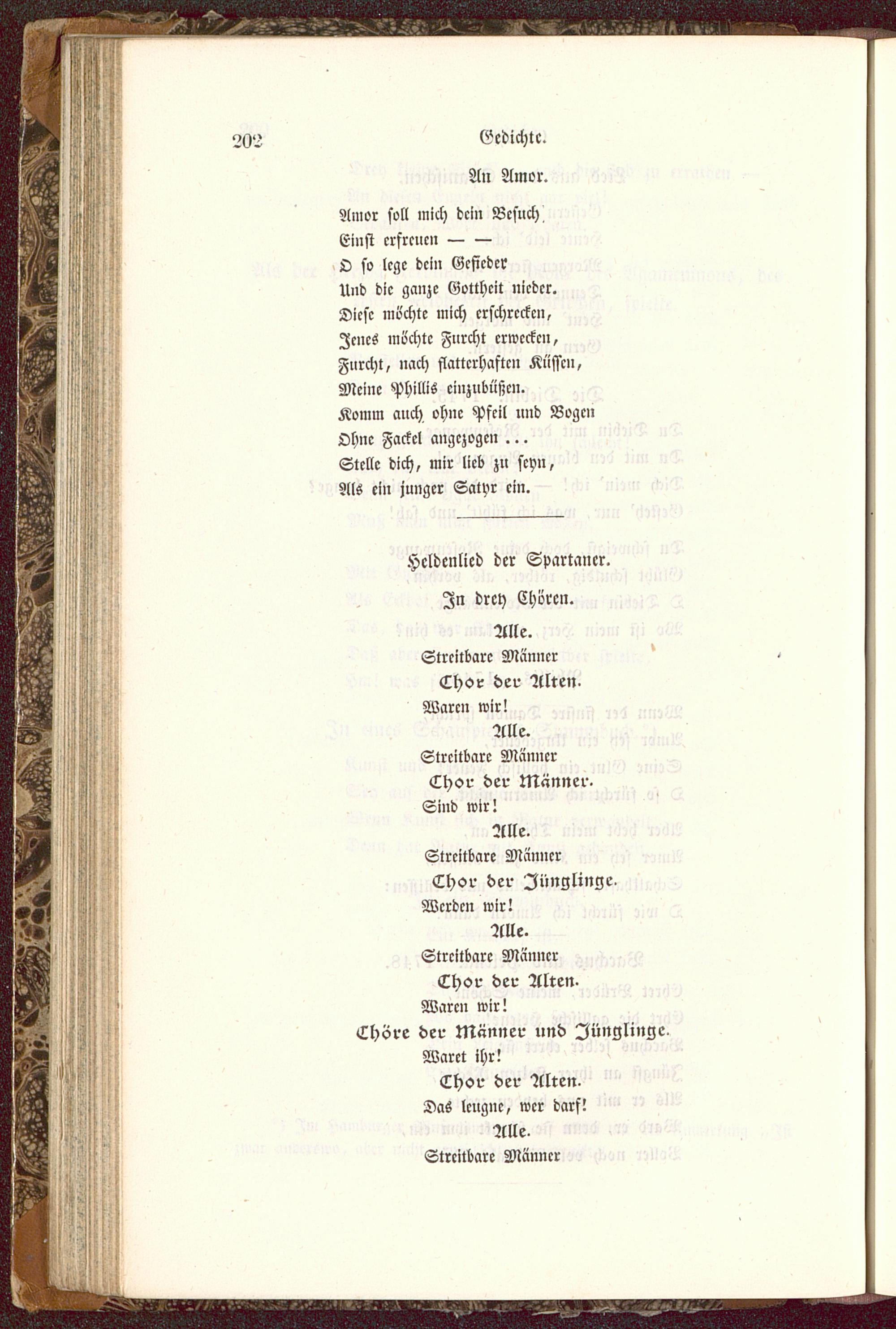 O so lege dein GefiederUnd die ganze Gottheit nieder.Diese möchte mich erschrecken,Jenes möchte Furcht erwecken,Furcht, mich flatterhaften Küssen,Meine Phillis einzubüßen.Komm auch ohne Pfeil und BogenOhne Fackel angezogen ...Stelle dich, mir lieb zu seyn,Als ein junger Satyr ein.