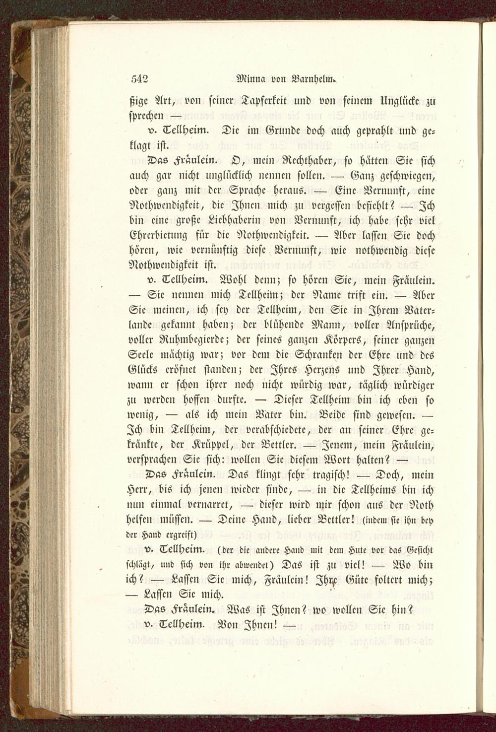 — Sie nennen mich Tcllhcim; der Name trift ein. — AberSie meinen, ich sey der Tcllhcim, den Sie in Zhrcm Vater-land? gekannt haben; der blühende Mann, voller Ansprüche,voller Ruhmbegierde; der seines ganzen Körpers, scincr ganzenSeele mächtig war; vor dem die Schranken der Ehre und desGlücks cröfuct standen; der Ihres Herzens und Ihrer Hand,wann cr schon ihrcr noch nicht würdig war, täglich würdigerzu werden hoffen durste. — Dieser Tcllhcim bin ich eben sowenig, — als ich mein Vatcr bin. Beide sind gewesen. —Ich bin Tcllhcim, dcr verabschiedete, der an seiner Ehre ge-kränkte, der Krüppel, dcr Vcttlcr. — Icncm, mcin Fräulci»,versprachen Sie sich: wollen Sie diesem Wort halten? —
