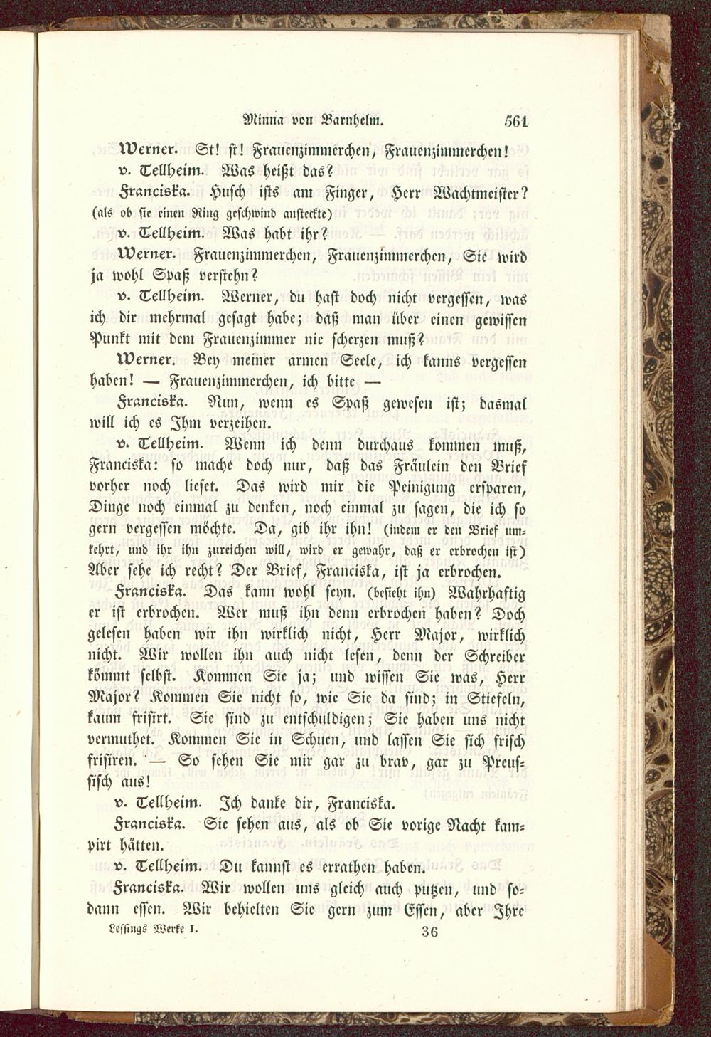 v. Tellheim. Werner, du hast doch nicht vergessen, wasich dir mchrmal gesagt habe; daß man über cincn gewissenPunkt mit dem Frauenzimmer nie scherzen muß?