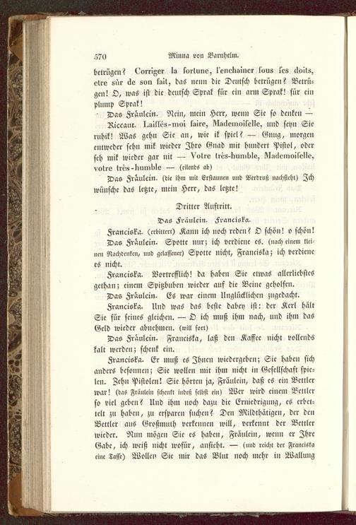 - Zvas Fräulein. Nci», nici» Herr, wen» Sie so dc»kc» —Riccaut- I^siMs-rnoi k-zire, Mclemoil'elle, und sey» Siernhik! Was gehn Sie a», wie ik spiel? — Gnug, niorgc»entweder sehn mit wieder Zhro Gnad mit hundert Pistol, oderseh »lik wieder gar »it — Votre tres-kunivle, IVI-uiemoilelle,votio tresi-kumlile — (eilends ab)