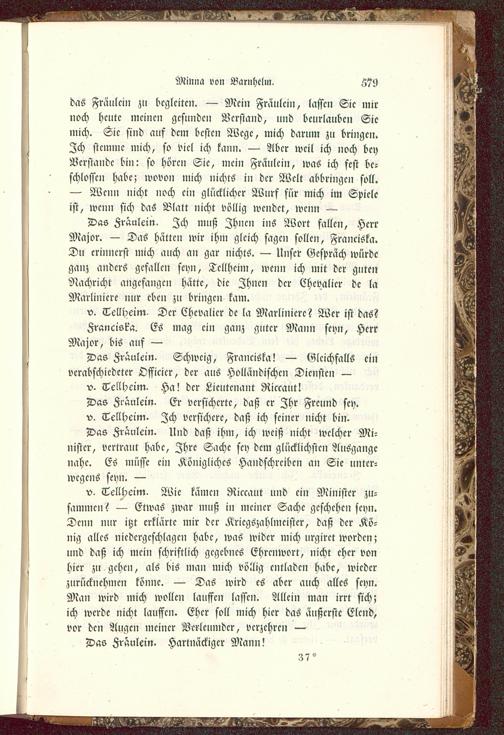 v. Tellheim. Wie kämen Riccaut und cin Minister zu-sammen? — Etwas zwar muß in meiner Sache geschehen seyn.Denn nur itzt erklärte mir dcr Kricgszahlmcistcr, daß dcr Kö-nig alles niedergeschlagen habe, was wider mich urgirct worden;und daß ich mcin schriftlich gcgcbncs Ehrcnwort, nicht chcr vonhier zu gchcn, als bis man mich völlig cntladcn habe, wicdcrzurücknchmcn könne. — Das wird es abcr auch alles seyn.Man wird mich wollen lauffcn lassen. Allein man irrt sich;ich werde nicht lauffcn. Ehcr soll mich hier das äußerste Elend,vor den Augen meiner Verleumder, verzehren —