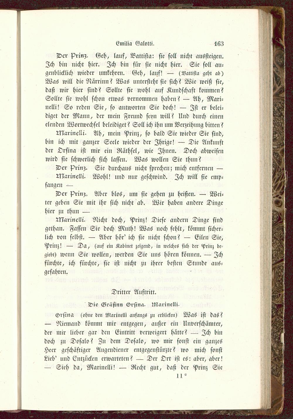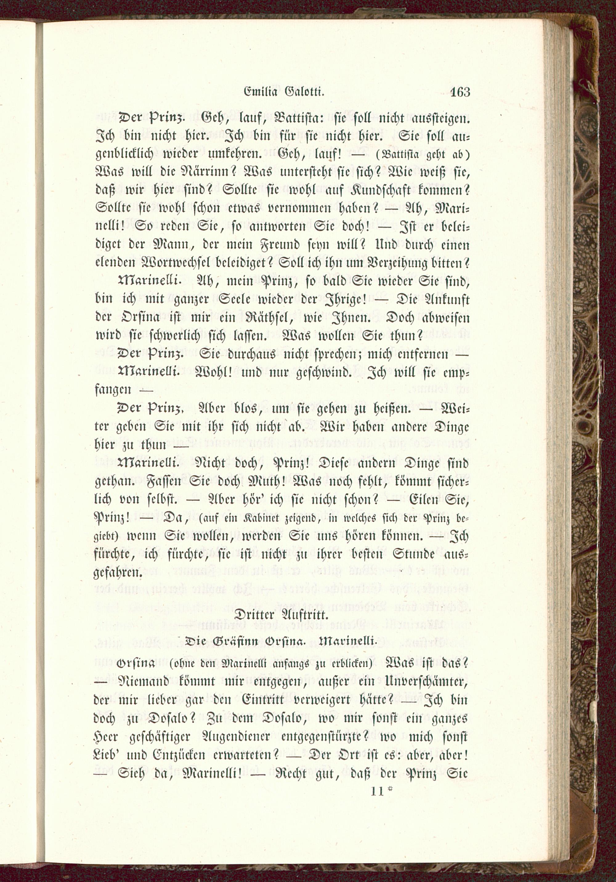 Marinelli. Ah, mein Prinz, so bald Sic wicdcr Sic sind,bin ich mit ganzer Seele wicdcr dcr Zhrigc! — Die Ankunftdcr Orsina ist mir ein Räthsel, wie Ihnen. Doch abweisenwird sie schwerlich sich lassen. Was wollen Sie thun?