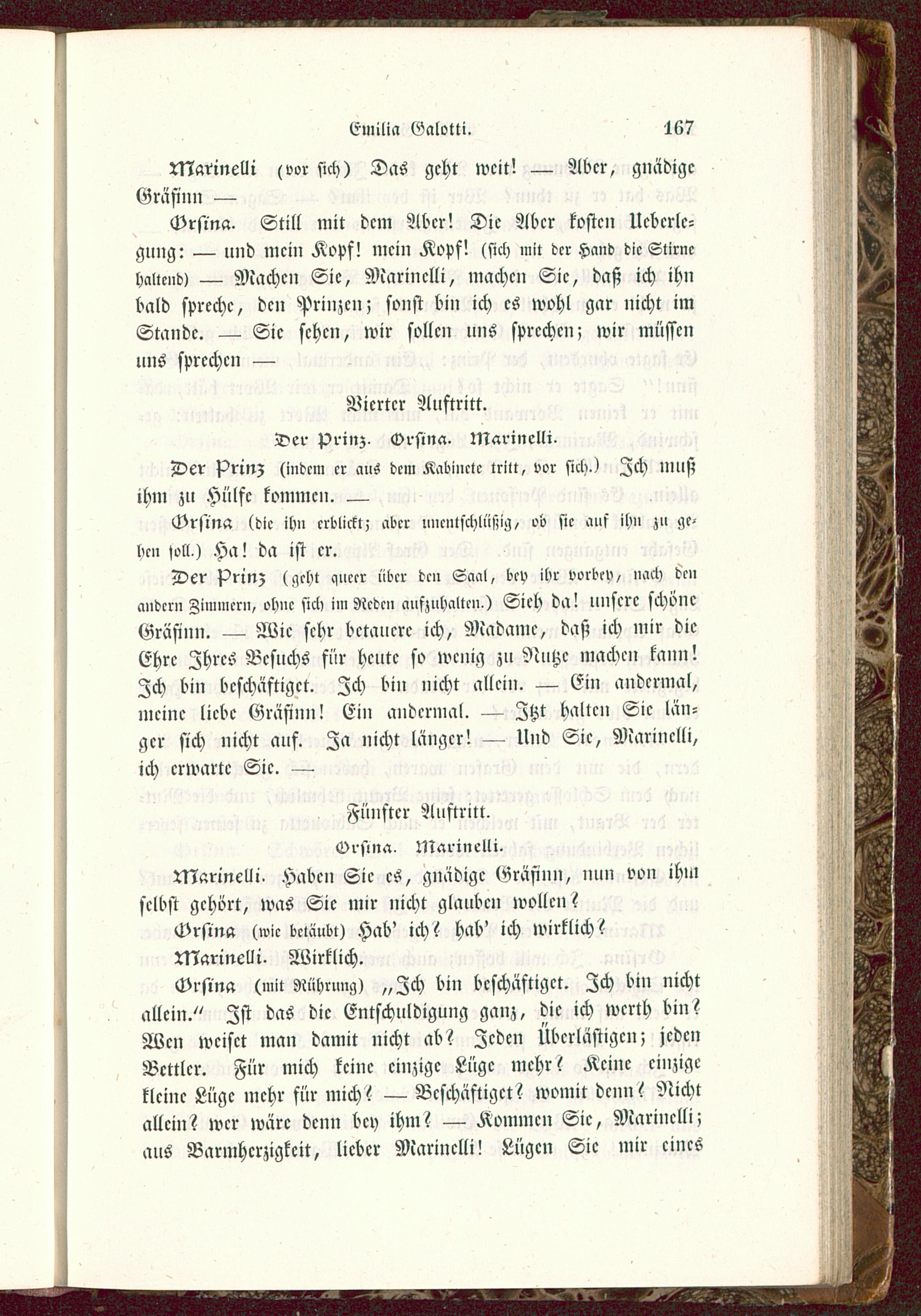 Orsina (mit Rührung) „Ich bin beschäftiget. Ich bin nichtallein." Ist das die Entschuldigung ganz, die ich werth bin?Wen weiset man damit nicht ab? Jeden Ubcrlästigcn; jedenBettler. Für mich keine einzige Lüge mehr? Keine einzigekleine Lüge mehr für mich? — Beschäftiget? womit denn? Nichtallein? wer wäre denn bey ihm? — Kommen Sie, Marinclli;aus Barmherzigkeit, lieber Marinclli! Lügen Sie mir eines