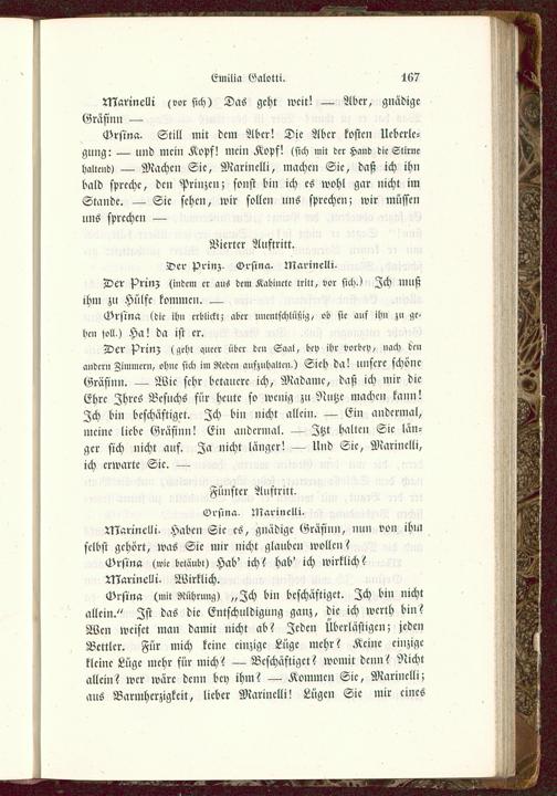 Fünfter Auftritt.Orsina. Marinelli.Marinelli. Haben Sie es, gnädige Gräfinn, nun von ihmselbst gehört, was Sie mir nicht glaubcu wollen?Grsina (wie betäubt) Hab' ich? hab' ich wirklich?Marinelli. Wirklich.