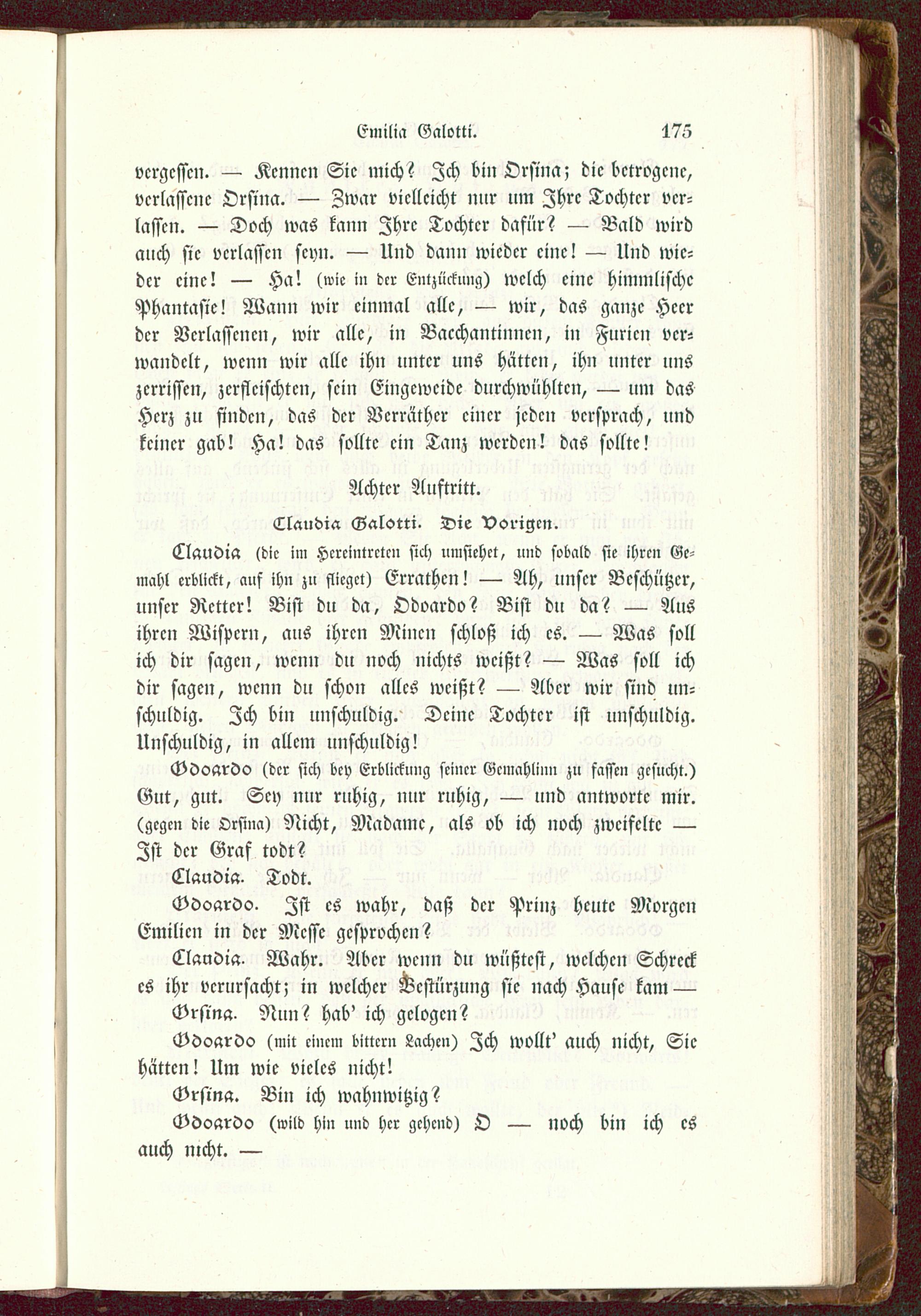 Claudia (die im Hcreintretm sich umsiehet, und sobald sie ihren Ge-mahl erblickt, auf ihn zu flieget) Errathen! — Ah, unser Beschützer,unser Retter! Bist du da, Odoardo? Bist du da? — Ausihren Wispern, aus ihren Minen schloß ich es. — Was sollich dir sagen, wenn du noch nichts weißt? — Was soll ichdir sagen, wenn du schon alles weißt? — Aber wir sind un-schuldig. Ich bin unschuldig. Deine Tochter ist unschuldig.Unschuldig, in allem unschuldig!