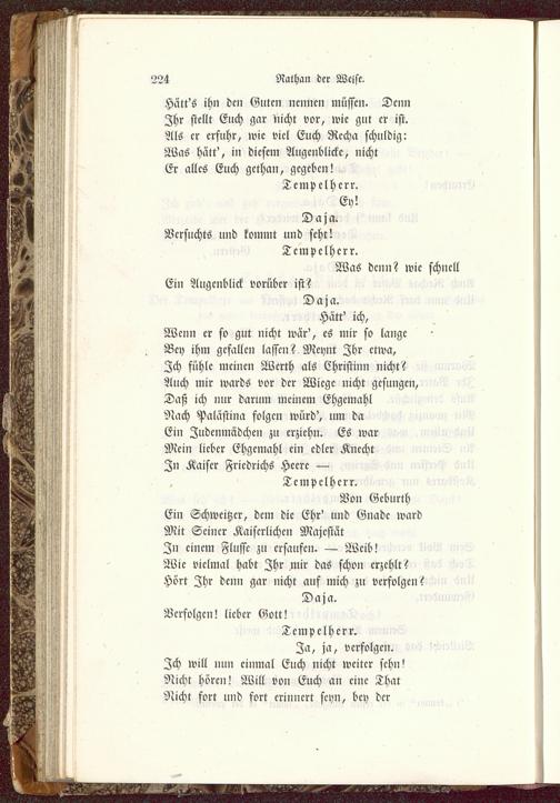 Tempelherr.Za, ja, verfolgen.Ich will nun einmal Euch nicht weiter sehn!Nicht hören! Will von Euch an eine ThatNicht fort und fort erinnert seyn, bey der