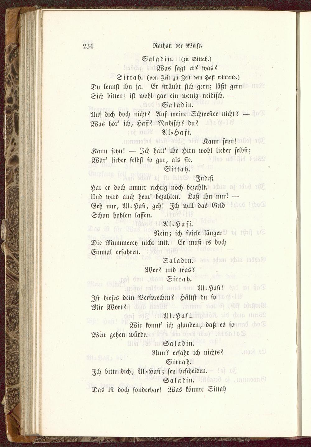 Sa lad in. (zu Siuah.)Was sagt er? was?Sittah. (von Zeit zu Zeit dem Hafi winkend.)Du kcniist ihn ja. Er sträubt sich gern; läßt gernSich bitten; ist wohl gar ein wenig neidisch. —Saladin.