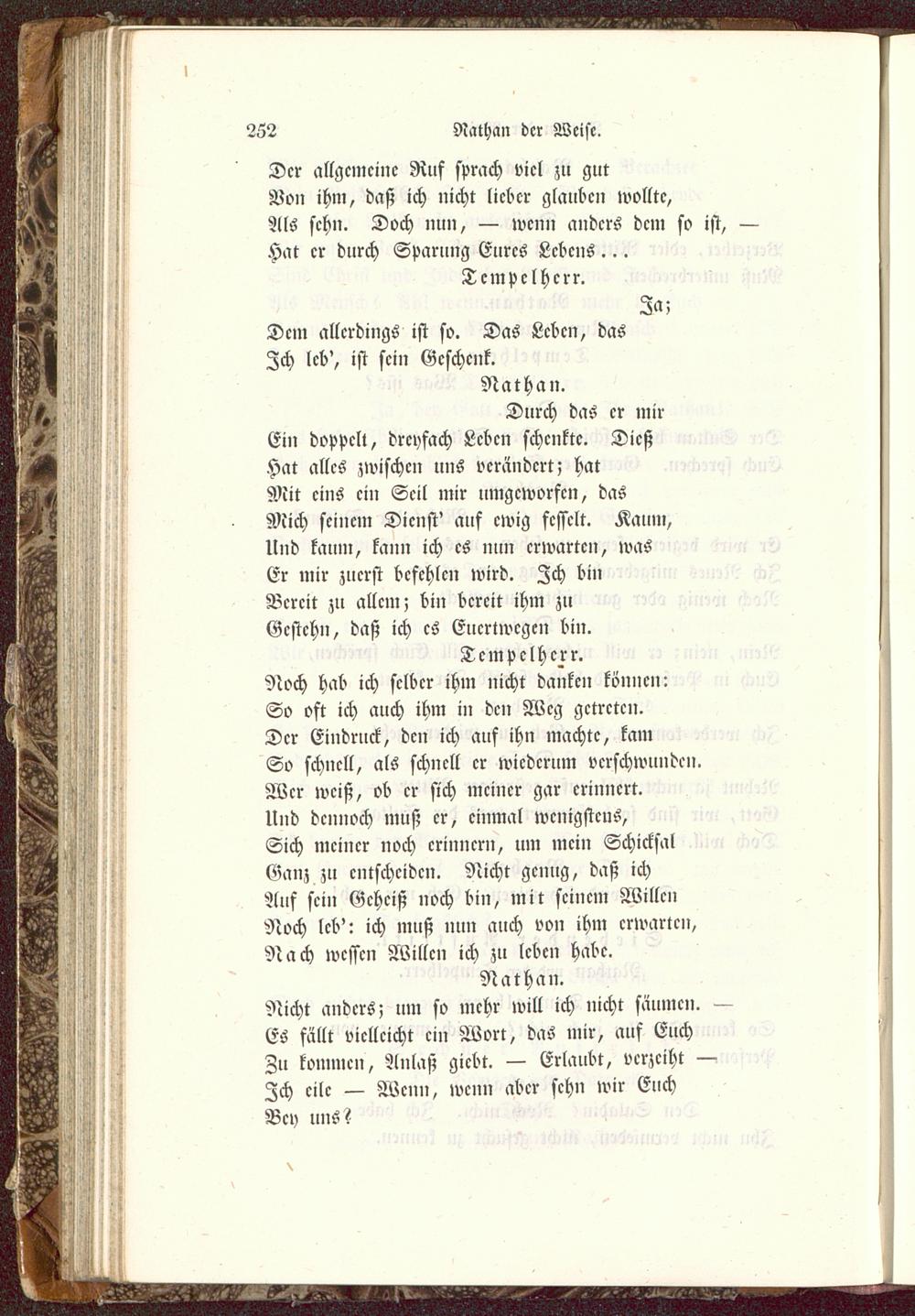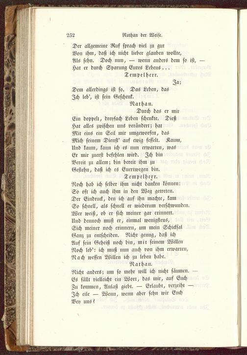 Tempelherr.Noch hab ich selber ihm nicht danken können:So oft ich auch ihm in den Weg getreten.Der Eindruck, den ich auf ihn machte, kamSo schnell, als schnell er wiederum verschwunden.Wer weiß, ob er sich meiner gar erinnert.Und dennoch muß er, einmal wenigstens,Sich meiner noch erinnern, um mein SchicksalGanz zu entscheiden. Nicht genug, daß ichAuf sei» Geheiß noch bin, mit seinem WillenNoch leb': ich muß nun auch von ihm erwarten,Nach wessen Willen ich zu leben habe.