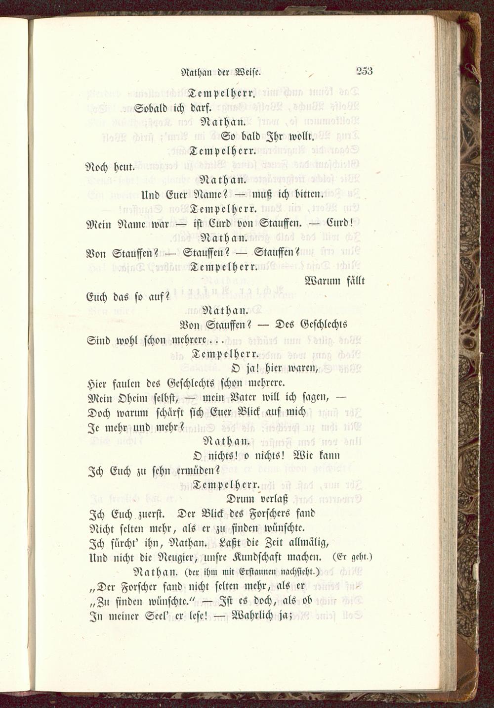 Nathan. (der ihm mit Erstaunen nachsieht.)„Der Forscher sand nicht selten mehr, als er„Zu finden wünschte." — Ist es doch, als obZn meiner Scel' er lese! — Wahrlich ja;