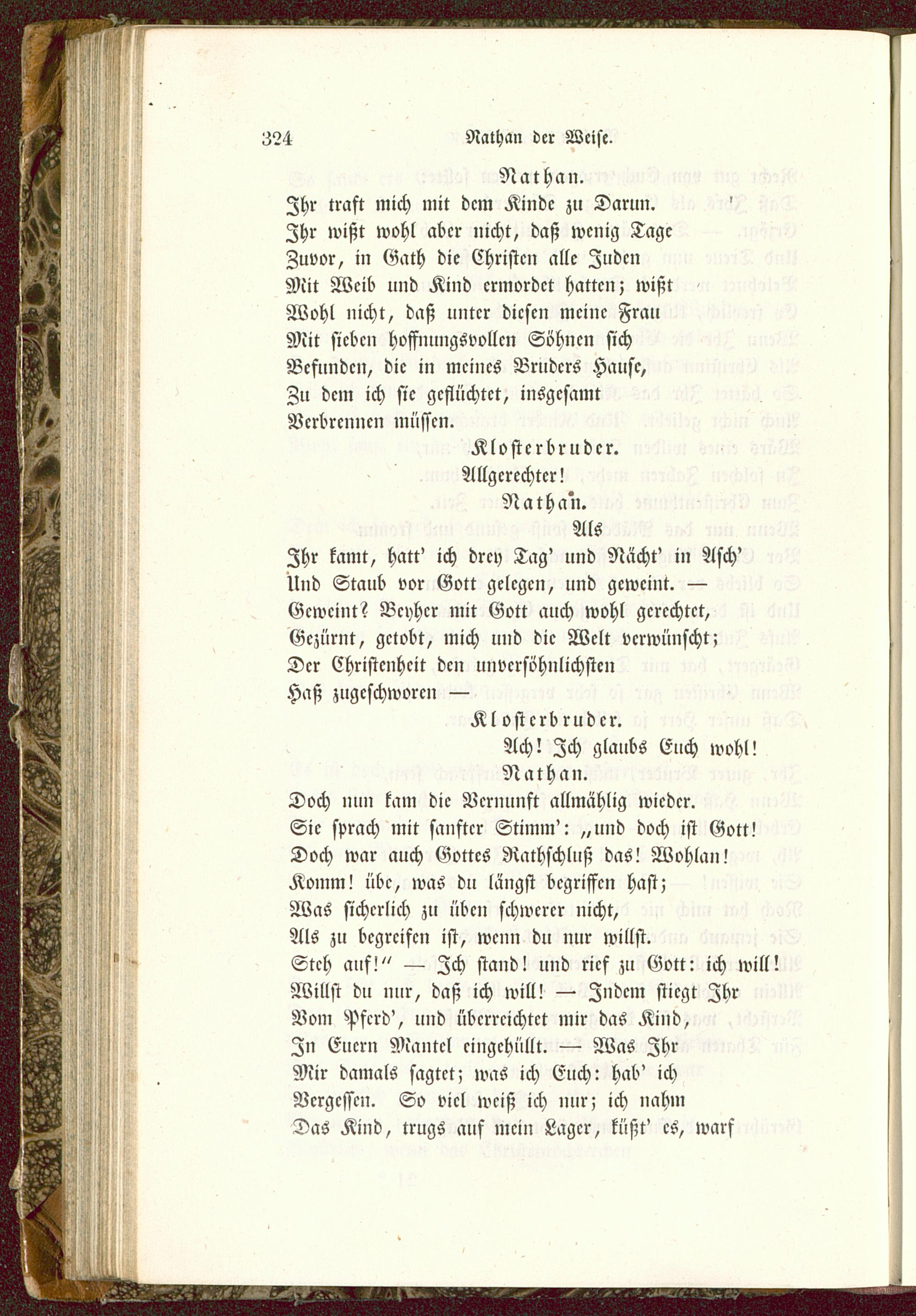 Ihr traft mich mit dem Kinde zu Darun.Ihr wißt wohl aber nicht, daß wenig TageZuvor, in Gath die Christen alle JudenMit Weib und Kind ermordet hatten; wißtWohl nicht, daß unter diesen meine FrauMit sieben hoffnungsvollen Söhnen sichBefunden, die in meines Bruders Hause,Zu dem ich sie gefluchtet, insgesamtVerbrennen müssen.