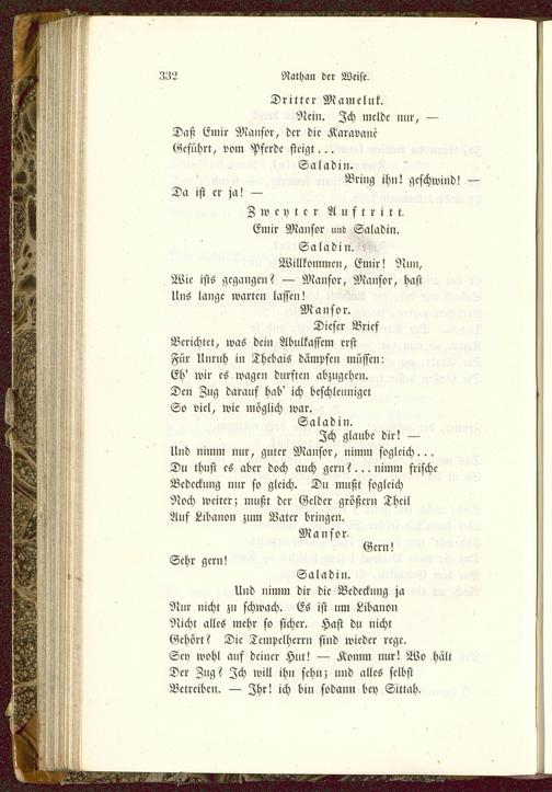 Zweyter Auftritt.Emir Mansor und Saladin .Saladin . .Willkommen, Emir ! Nnn,Wie ists gegangen? — Mansor, Mansor, hast