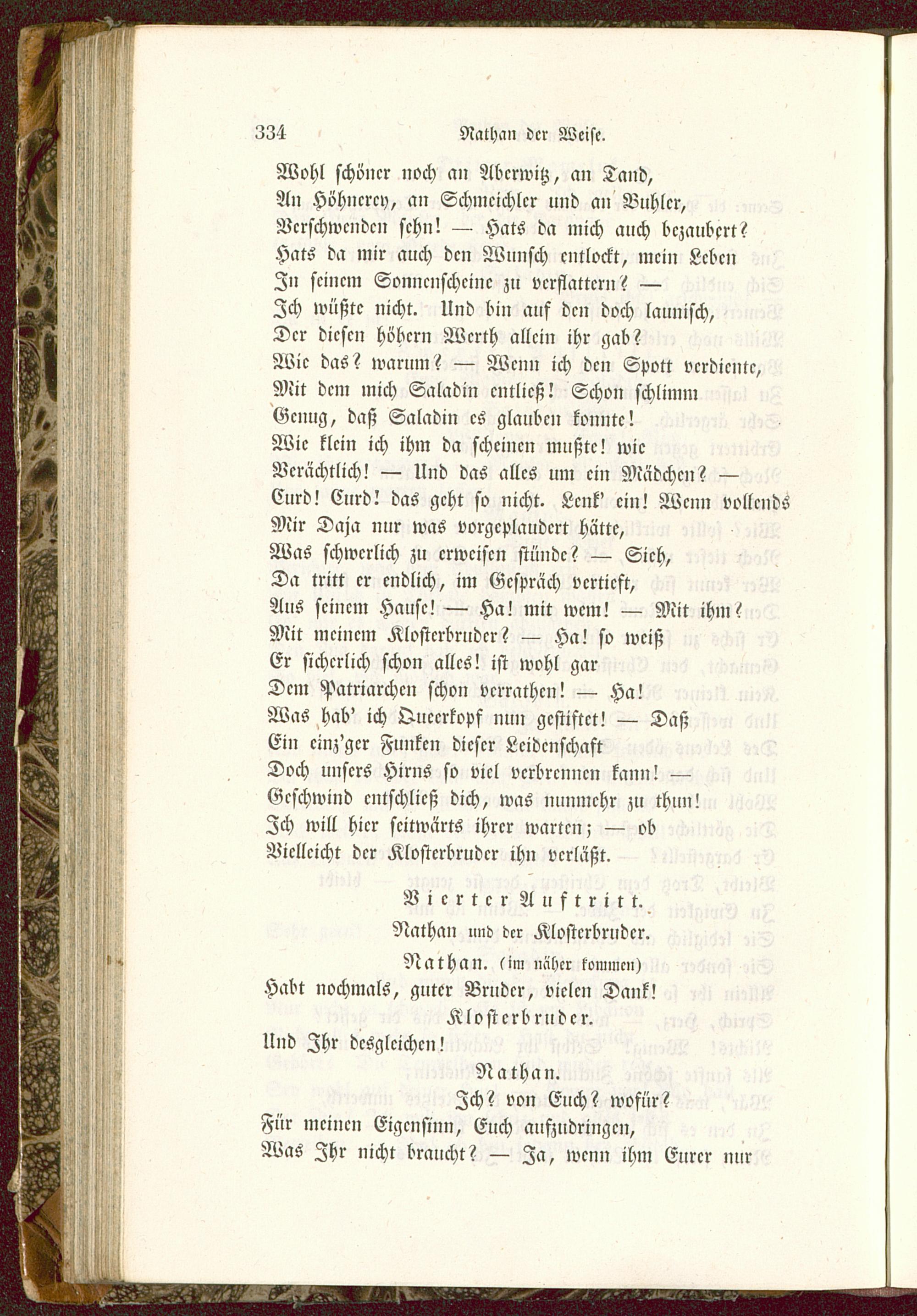 Vierter Auftritt.Nathan und der Klosterbruder.Nathan. fim näher kommen)Habt nochmals, guter Bruder, vielen Dank!