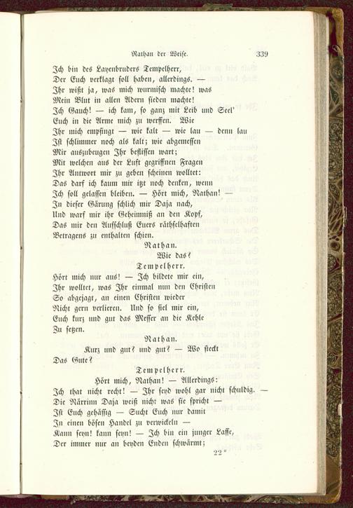 Tempelherr.Hört mich, Nathan! — Allerdings:Zch that nicht recht! — Zhr seyd wohl gar nicht schuldig. —Die Närrinn Daja weiß nicht was sie spricht —Zst Euch gehässig — Sucht Euch nur damitZn einen bösen Handel zu verwickeln —Kann seyn! kann seyn! — Zch bin ein junger Lasse,Der immer nur an beyden Enden schwärmt;