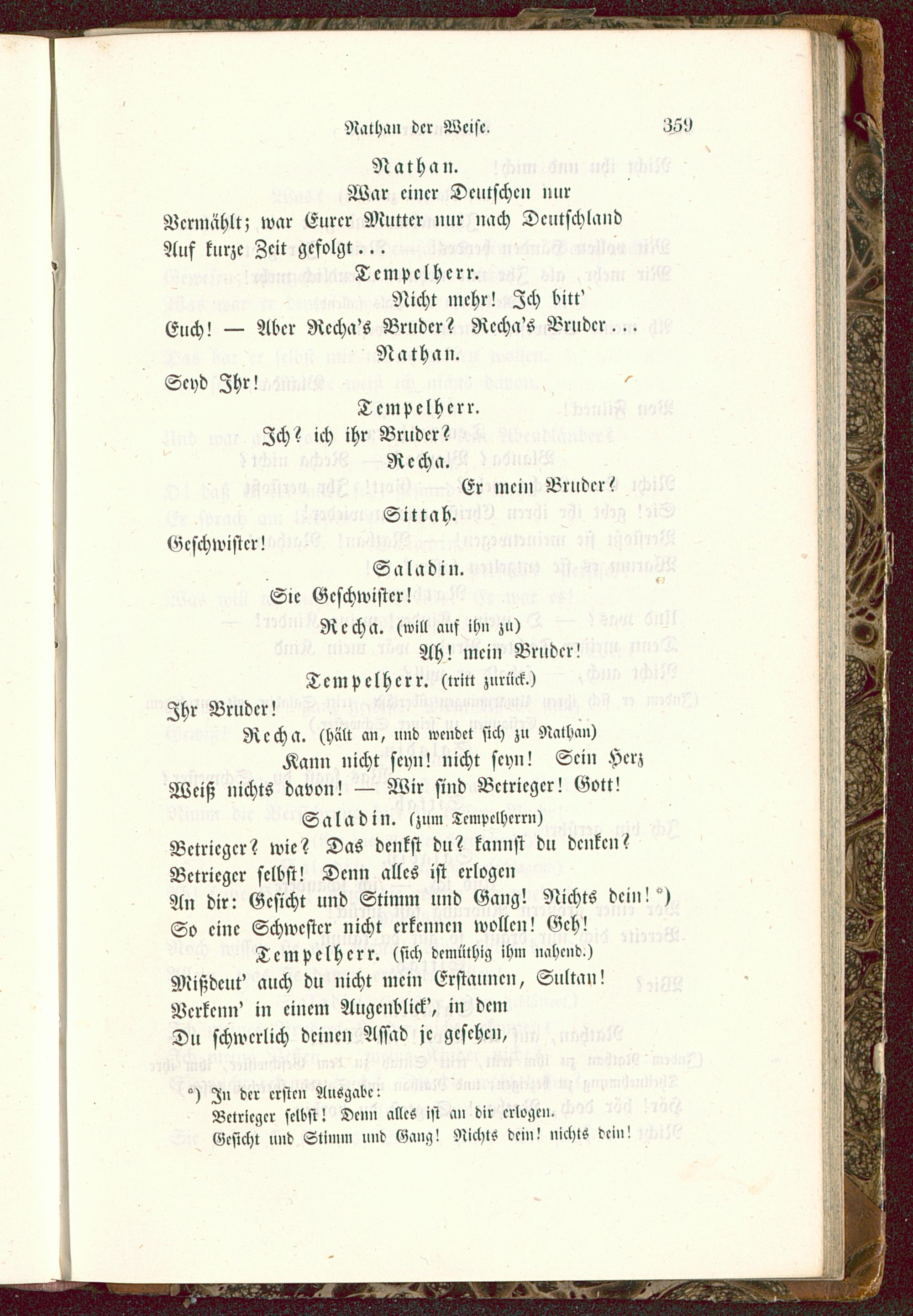SaladiN. lzum Tempelherrn)Bctriegcr? wie? Das denkst du? kannst du denken?Bctriegcr selbst! Denn alles ist erlogenAn dir: Gesicht und Stimm und Gang! Nichts dein!")So eine Schwester nicht erkennen wollen! Geh!
