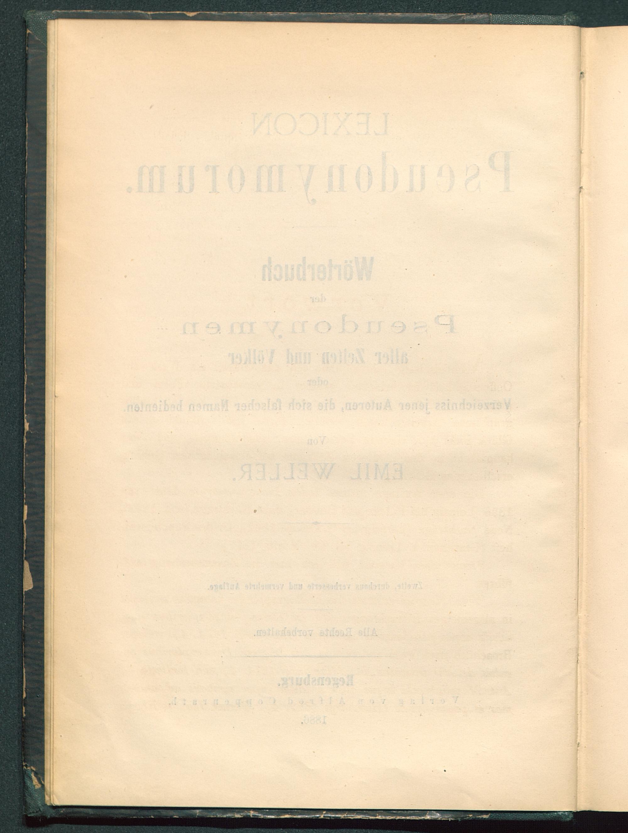 Lexicon pseudonymorum : Wörterbuch der Pseudonymen aller Zeiten und Völker oder Verzeichniss jener Autoren, die sich falscher Namen bedienten / Emil Weller