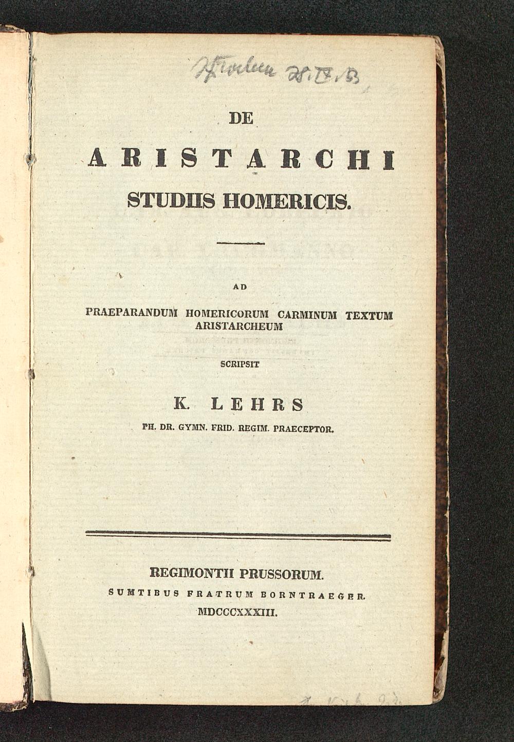 De Aristarchi studiis Homericis : ad praeparandum Homericorum carminum textum Aristarcheum / scripsit K. Lehrs