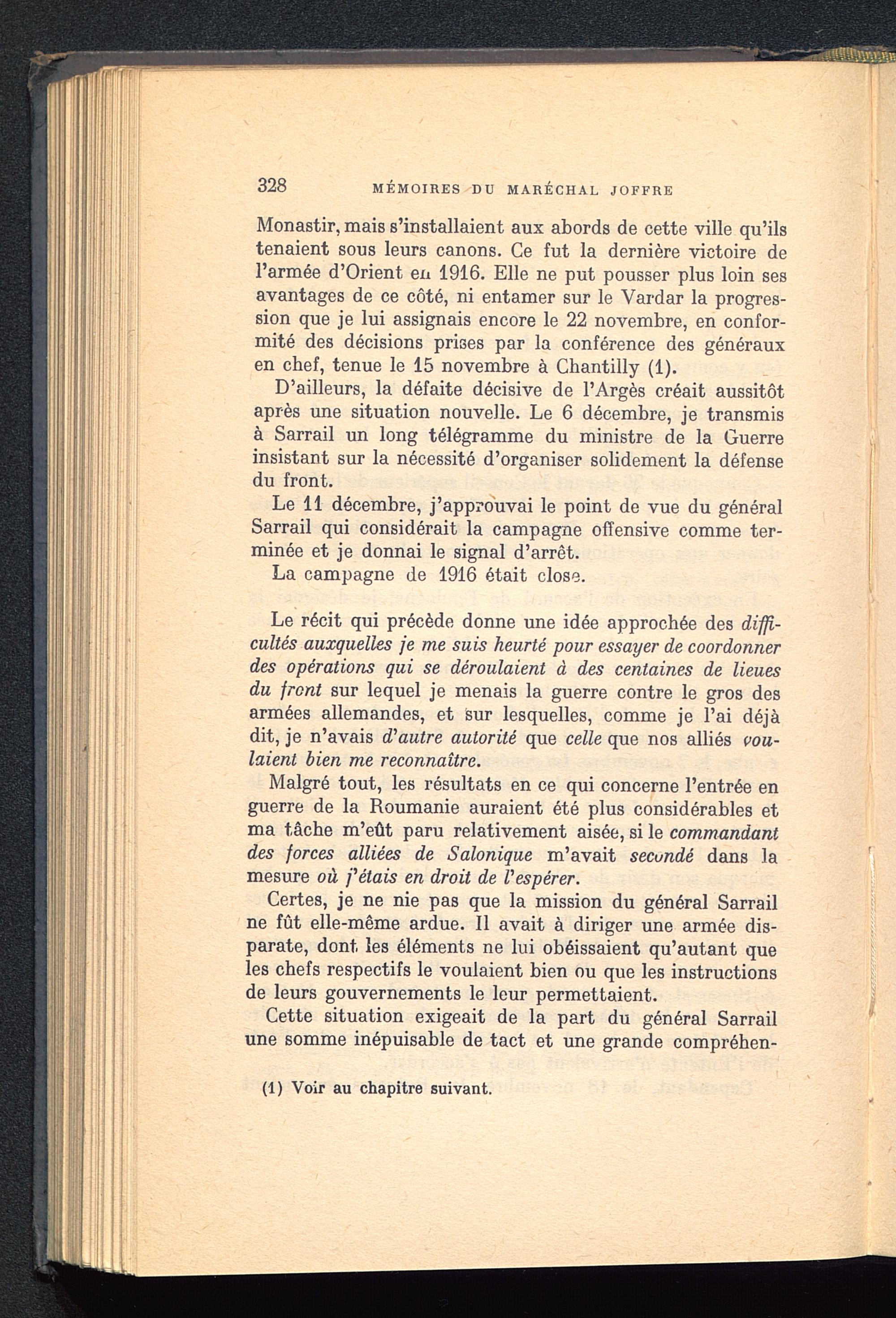 Chaptire Premier. La Conférence de Chantilly (6-7-8 décembre 1915) — Le bilan de l’année 1915. — Le plan d’action de la coalition pour 1916. — Le général sir Douglas Haig remplace le maréchal French. — L'Entente avec les Russes. — L'armée italienne. — L'action de la coalition en Orient. — Le sauvetage de l'armée serbe. — La Roumanie. — La guerre économique