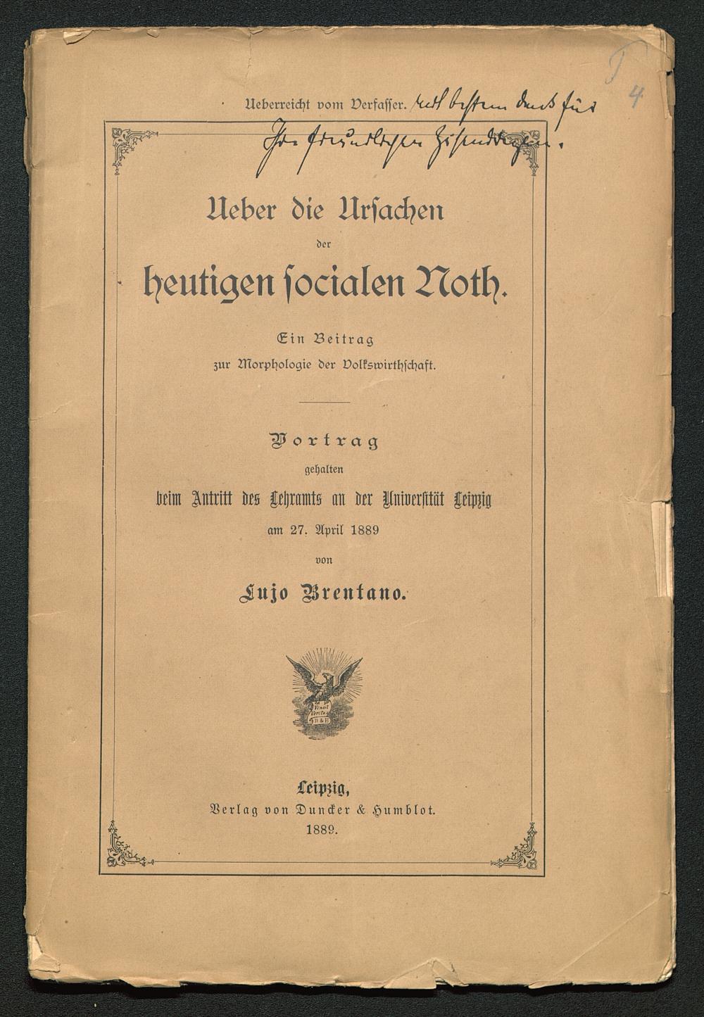 Über die Ursachen der heutigen socialen Noth [sozialen Not] : ein Beitr. zur Morphologie d. Volkswirthschaft ; Vortr. gehalten beim Antritt d. Lehramts an d. Univ. Leipzig am 27. Apr. 1889 / von Lujo Brentano