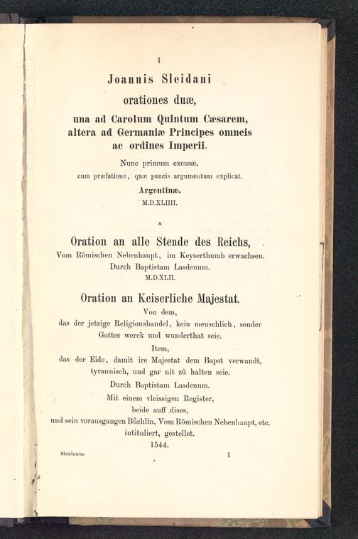 Joannis Sleidani orationes duæ, una ad Carolum Quintum Cæsarem altera ad Germaniæ Principes omneis ac ordines Imperii. Oration an alle Stende des Reichs, Vom Römischen Nebenhaupt, im Keyserthumb erwachsen