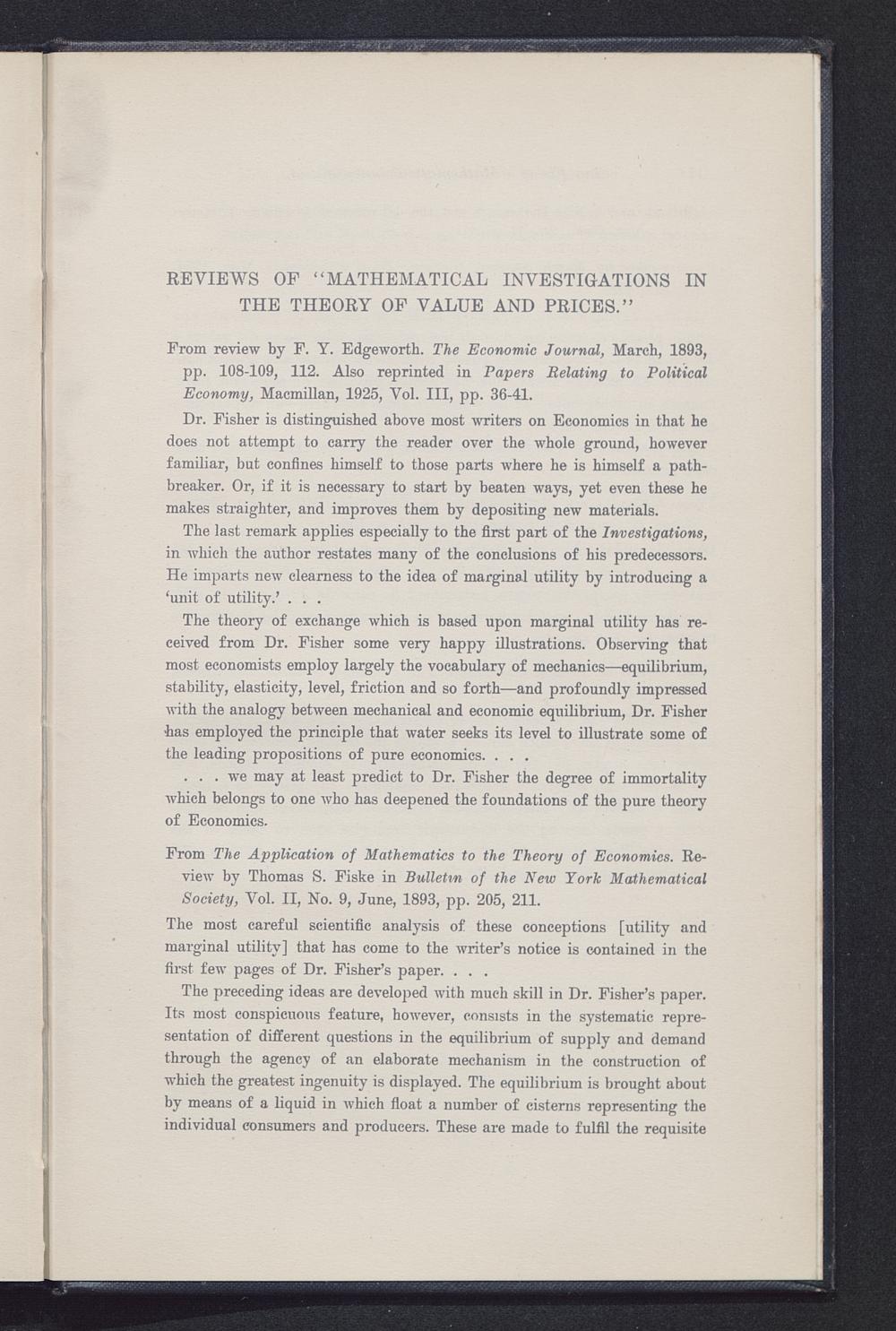Reviews of "Mathematical investigations in the theory of value and prices."