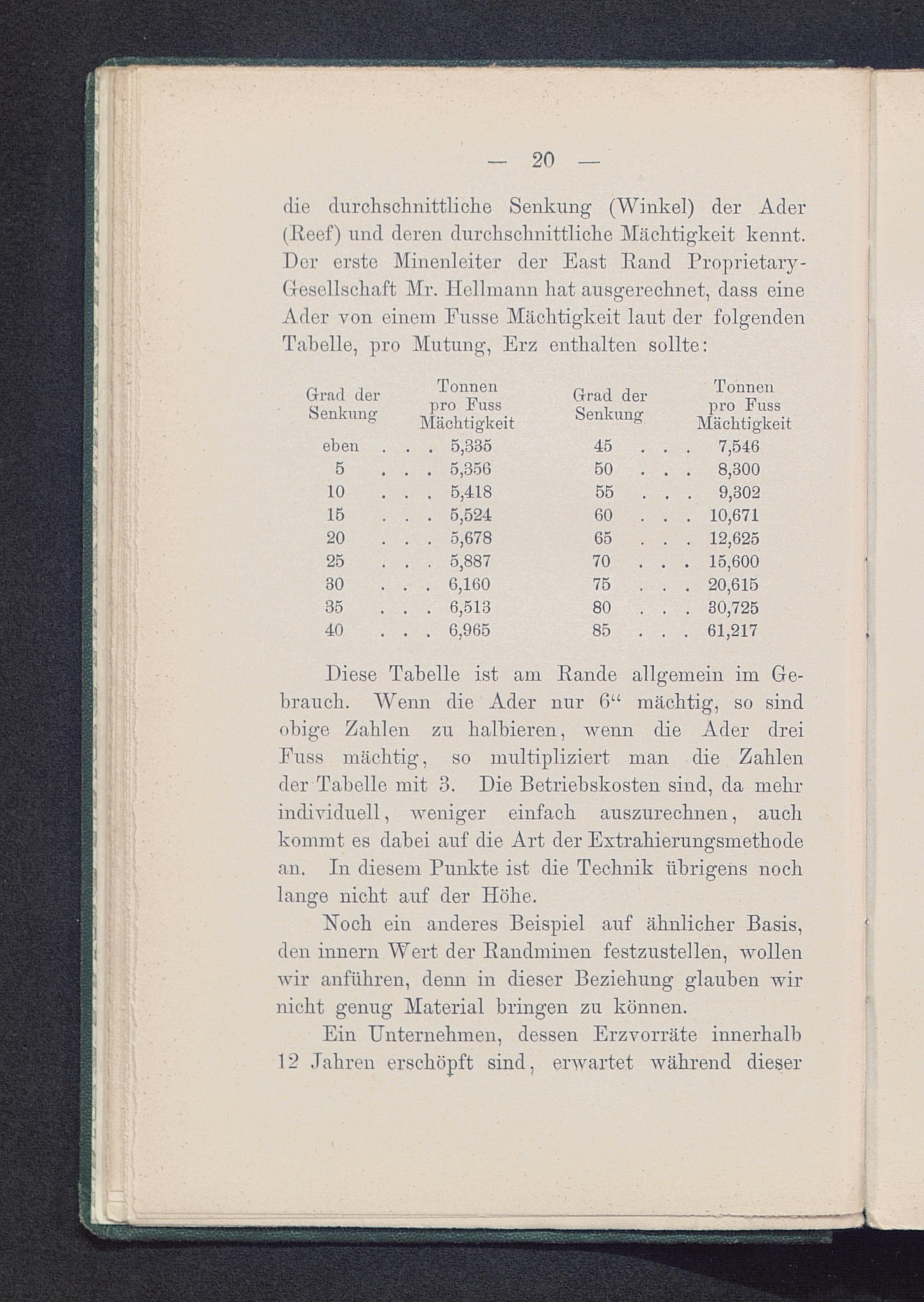 Tabelle der Lage der Randminen längs des Erzganges (Main keef)