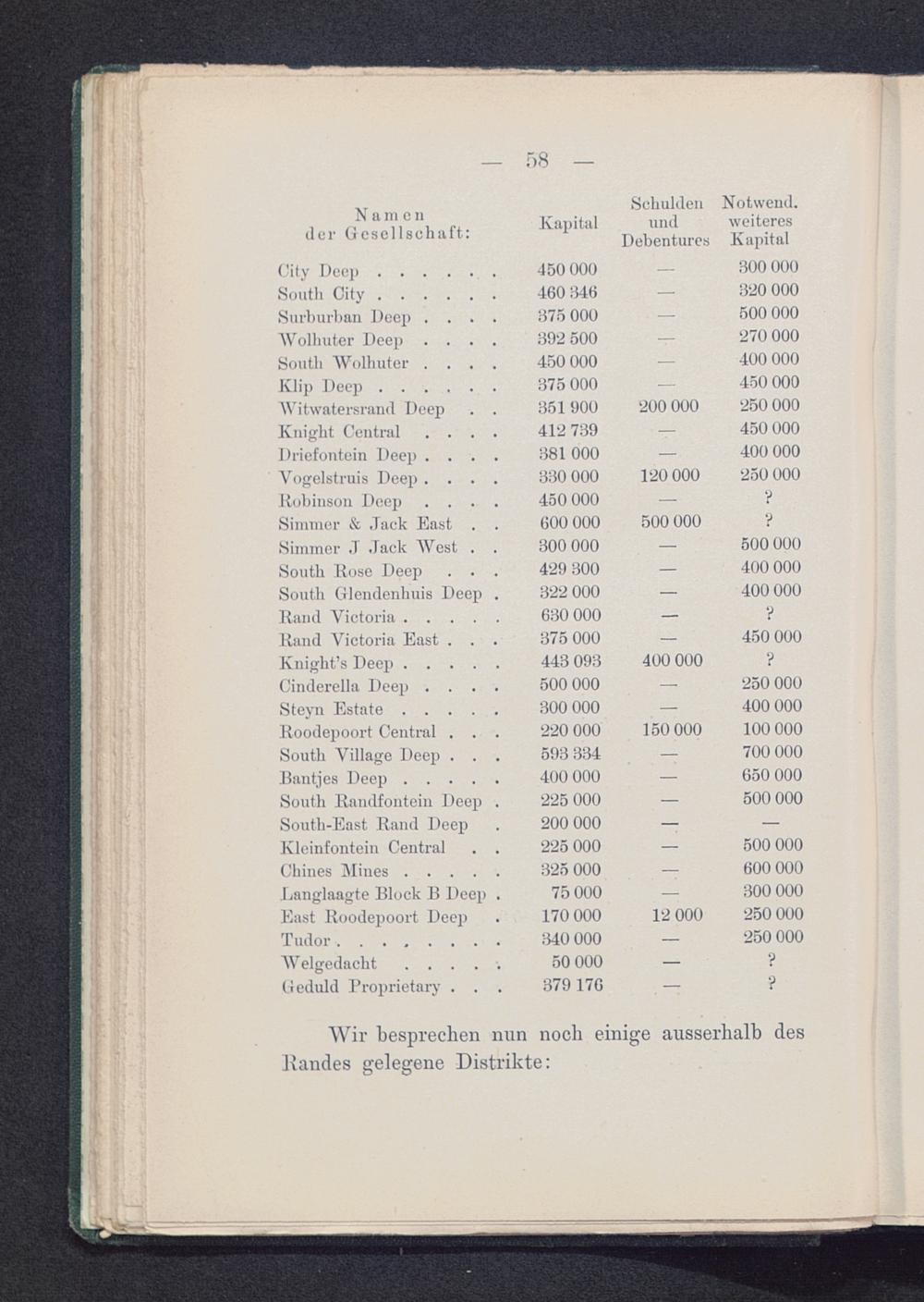Tabelle der Lage der Randminen längs des Erzganges (Main keef)