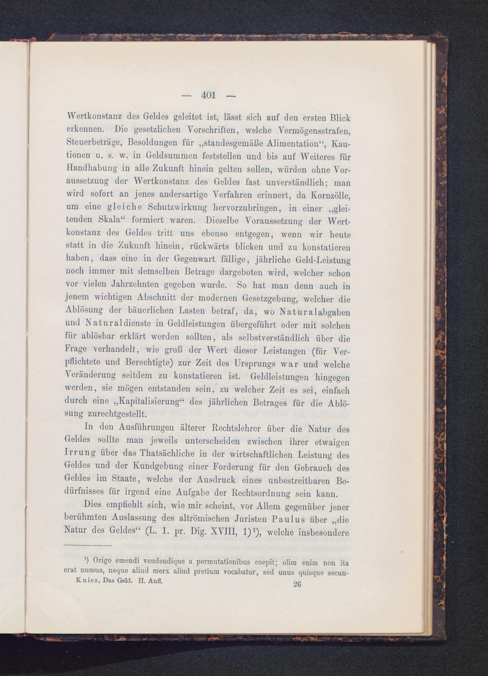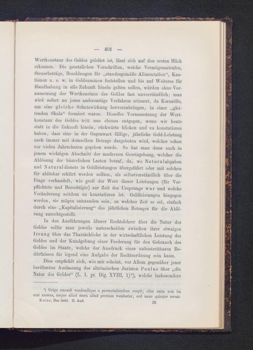 Das Geld : Darlegung der Grundlehren von dem Gelde, insbesondere der wirtschaftlichen und der rechtsgiltigen Functionen des Geldes, mit einer Erörterung über das Kapital und die Übertragung der Nutzungen / von Karl Knies