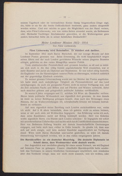 Die Denkschrift des Fürsten Lichnowsky : [der vollständige Wortlaut] ; meine Londoner Mission 1912 - 14, von Fürst Lichnowsky, ehemaliger deutscher Botschafter in London ; [zur Vorgeschichte des Krieges] / hrsg. von einer Gruppe von Friedensfreunden