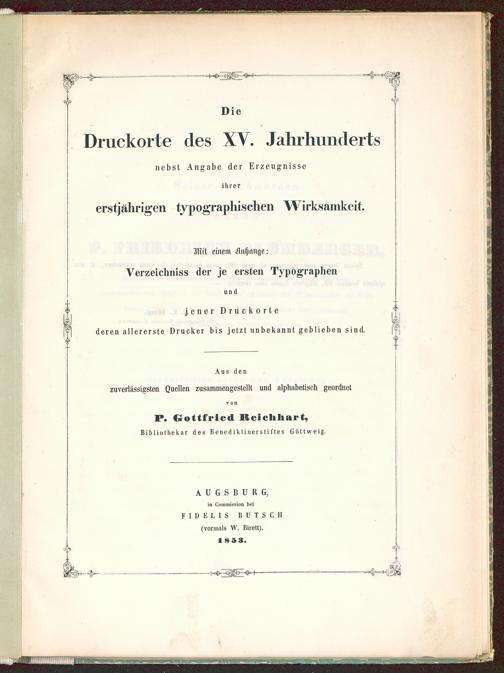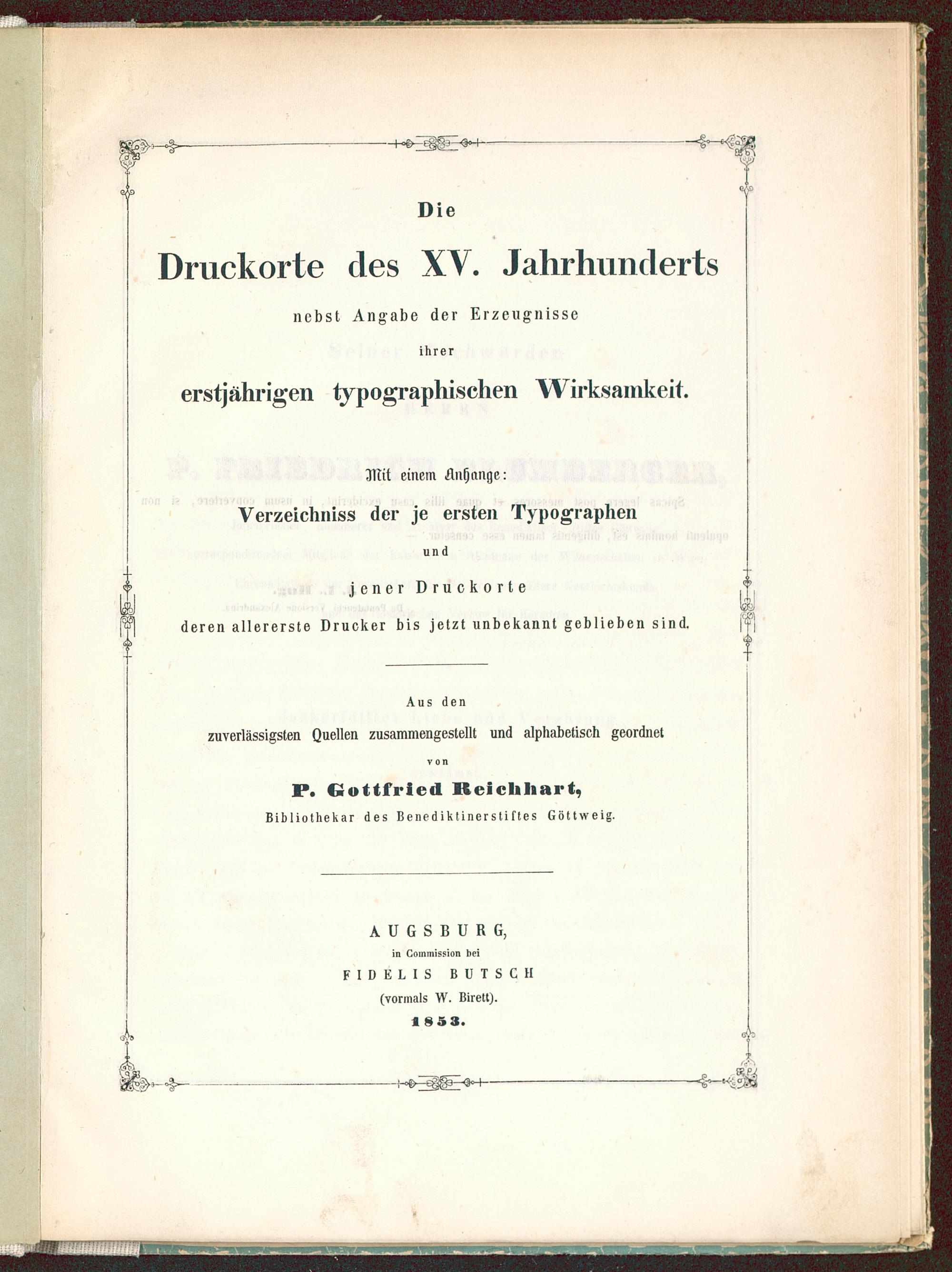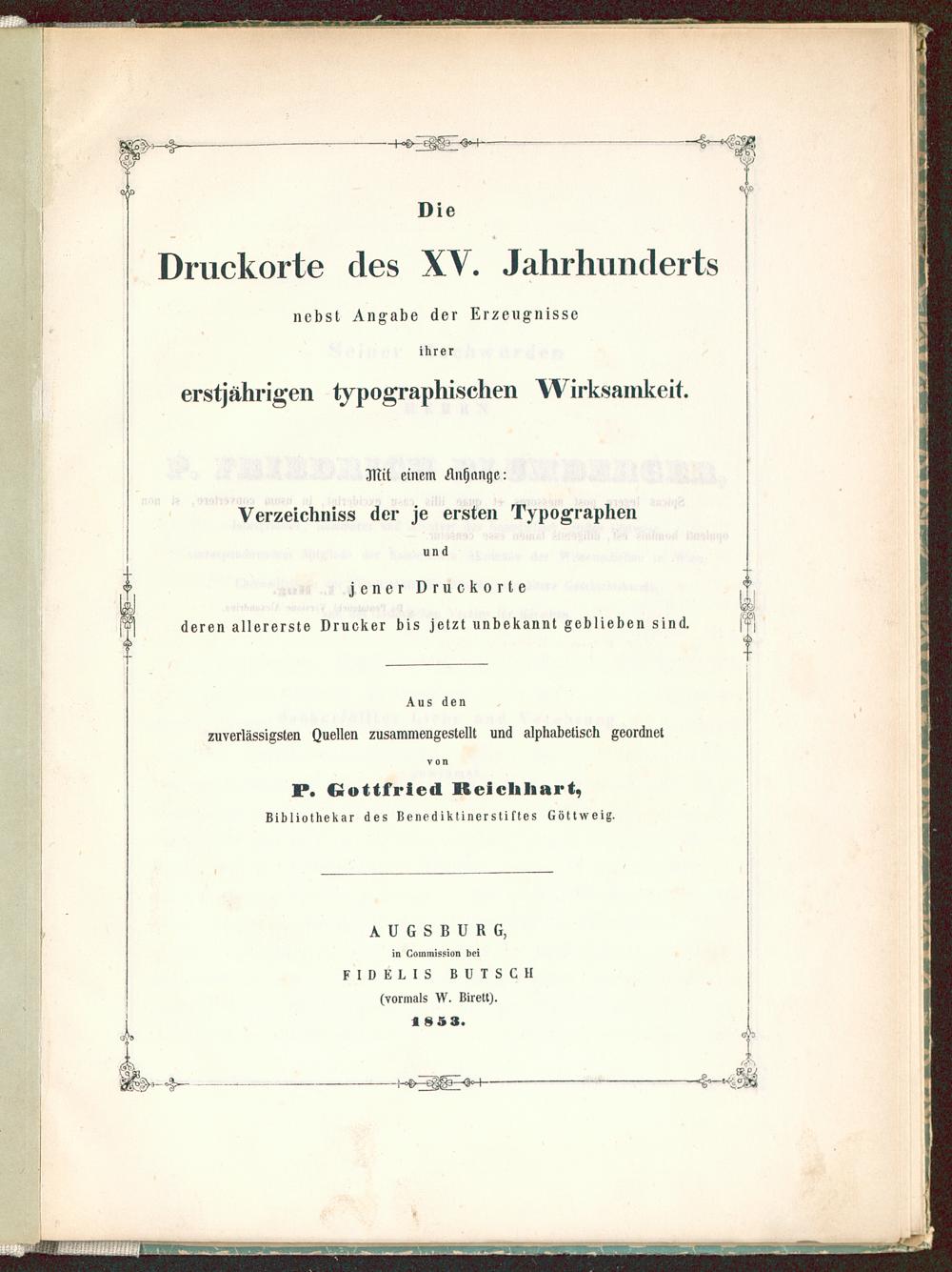 Die Druckorte des 15. Jahrhunderts nebst Angabe der Erzeugnisse ihrer erstjährigen typographischen Wirksamkeit / Gottfried Reichhart