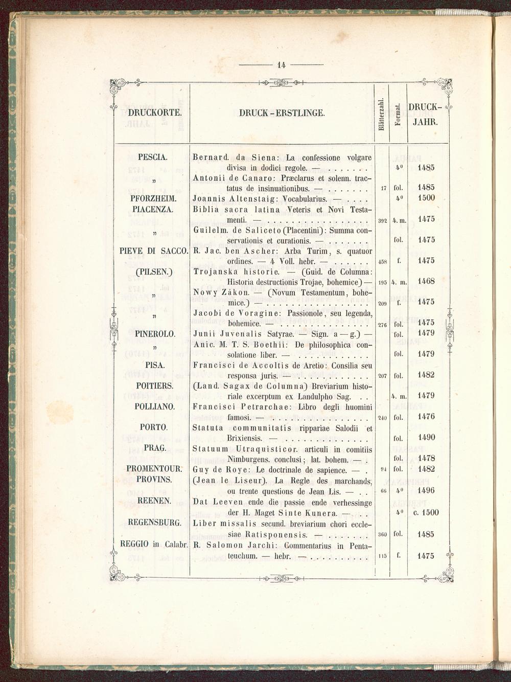 I. Verzeichnis der je ersten bekannten Typographen in den Druckorten des XV. Jahrhunderts