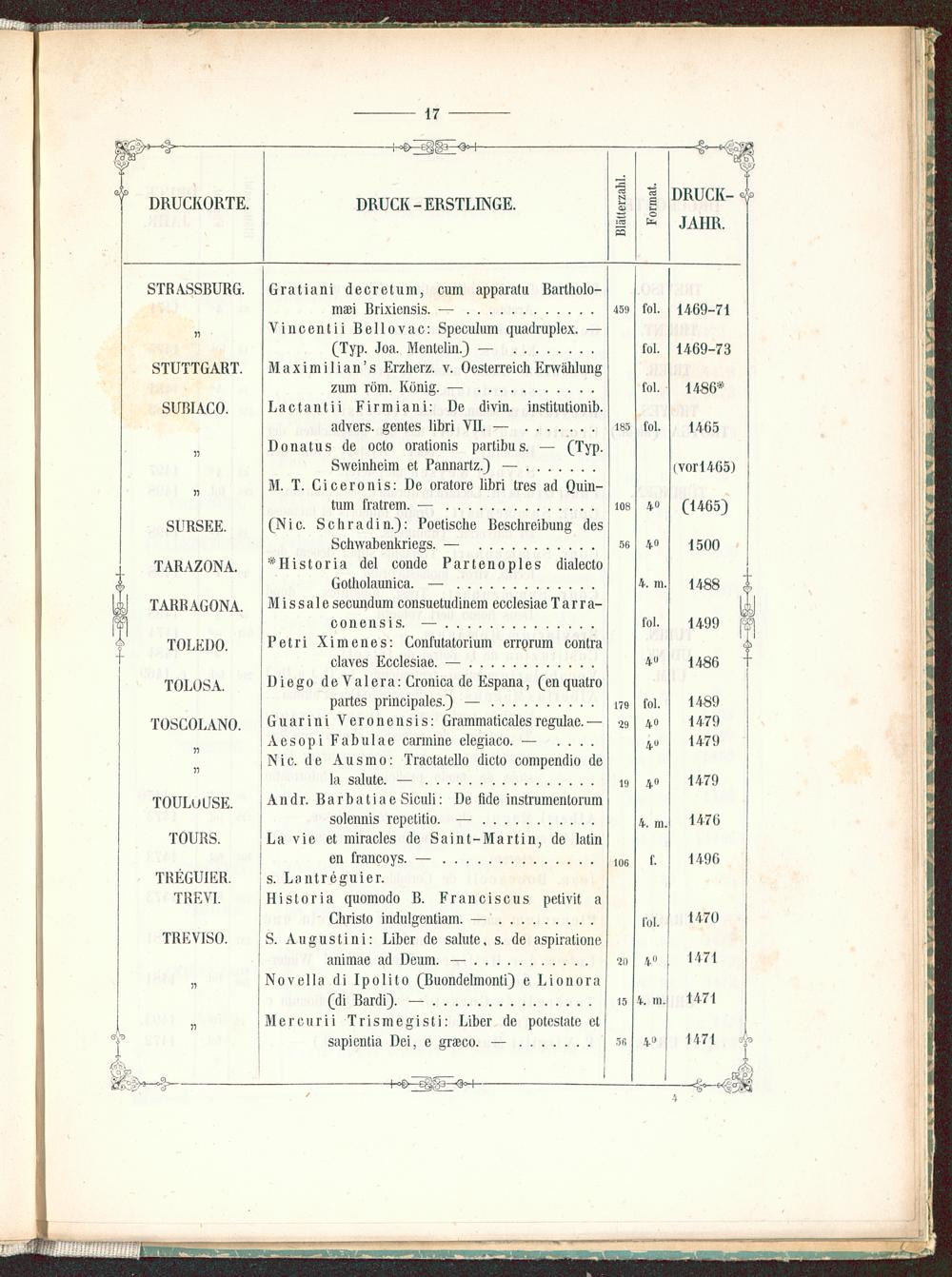 Alphabetisches Verzeichnis der Druckorte des XV. Jahrhunderts mit Einschluss von 1500, nebst Angabe der Erzeugnisse ihrer erstjährigen typographischen Wirksamkeit. (Wiegendruck - Erstlinge)