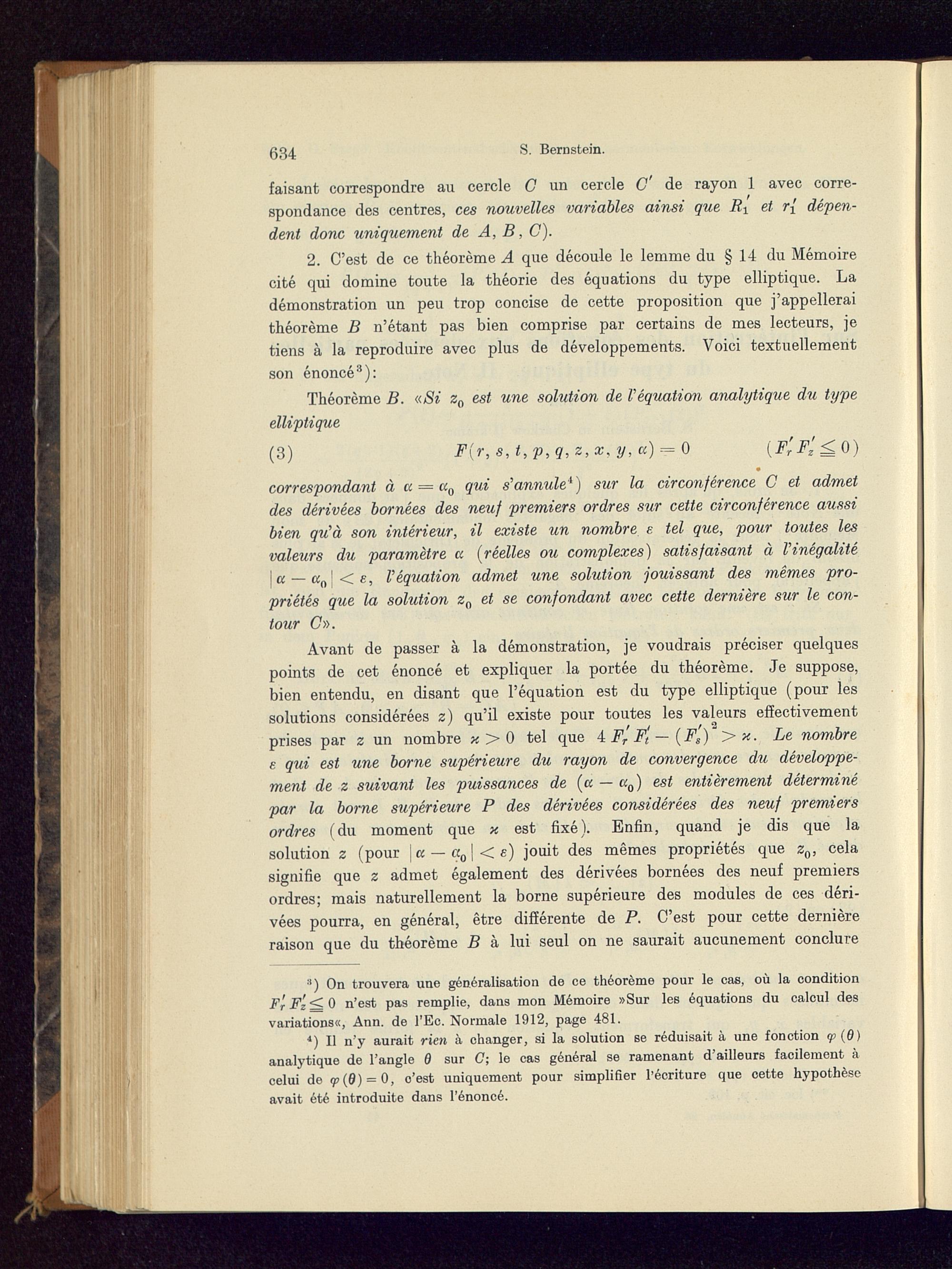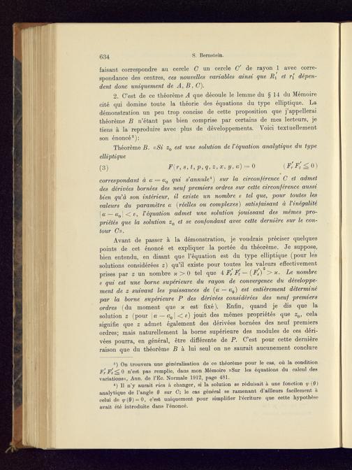 2. C'est de ce théorème A que découle le lemme du § 14 du Mémoirecité qui domine toute la théorie des équations du type elliptique. Ladémonstration un peu trop concise de cette proposition que j'appelleraithéorème B n'étant pas bien comprise par certains de mes lecteurs, jetiens à la reproduire avec plus de développements. Voici textuellementson énoncé 3 ):