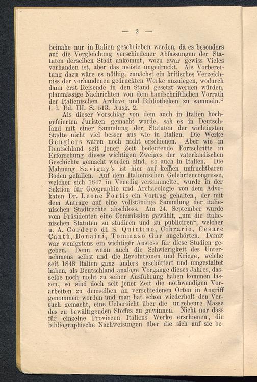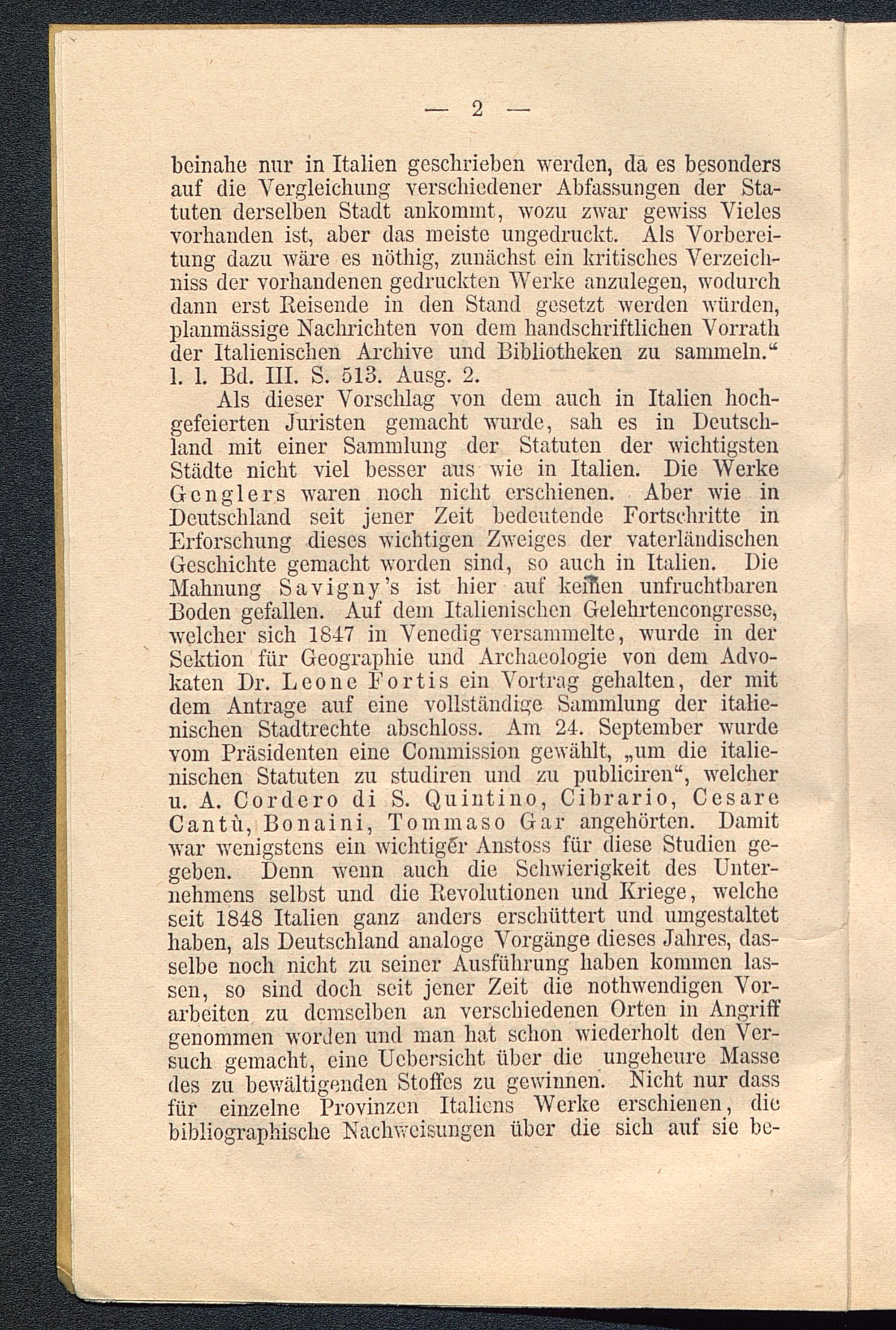 Als dieser Vorschlag von dem auch in Italien hoch-gefeierten Juristen gemacht wurde, sah es in Deutsch-land mit einer Sammlung der Statuten der wichtigstenStädte nicht viel besser aus wie in Italien . Die WerkeGcnglers waren noch nicht erschienen. Aber wie inDeutschland seit jener Zeit bedeutende Fortschritte inErforschung dieses wichtigen Zweiges der vaterländischenGeschichte gemacht worden sind, so auch in Italien. DieMahnung Savigny’s ist hier auf keflien unfruchtbarenBoden gefallen. Auf dem Italienischen Gelehrtencongrcssc,welcher sich 1847 in Venedig versammelte, wurde in derSektion für Geographie und Archaeologie von dem Advo-katen Dr. Leone Fortis ein Vortrag gehalten, der mitdem Anträge auf eine vollständige Sammlung der italie-nischen Stadtrechte abschloss. Am 24. September wurdevom Präsidenten eine Commission gewählt, „um die italie-nischen Statuten zu studiren und zu publiciren“, welcheru. A. Cordcro di S. Quintino, Cibrario, CesareCantü, Bonaini, Tommaso Gar angehörten. Damitwar wenigstens ein wichtiger Anstoss für diese Studien ge-geben. Denn wenn auch die Schwierigkeit des Unter-nehmens selbst und die Revolutionen und Kriege, welcheseit 1848 Italien ganz anders erschüttert und umgestaltethaben, als Deutschland analoge Vorgänge dieses Jahres, das-selbe noch nicht zu seiner Ausführung haben kommen las-sen, so sind doch seit jener Zeit die nothwendigen Vor-arbeiten zu demselben an verschiedenen Orten in Angriffgenommen worden und man hat schon wiederholt den Ver-such gemacht, eine Ucbcrsicht über die ungeheure Massedes zu bewältigenden Stoffes zu gewinnen. Nicht nur dassfür einzelne Provinzen Italiens Werke erschienen, diebibliographische Nachweisungen über die sich auf sie be-
