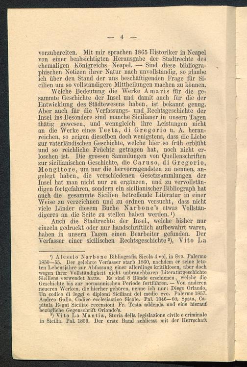 Welche Bedeutung die Werke Amaris für die ge-sammte Geschichte der Insel und damit auch für die derEntwicklung des Städtewesens haben, ist bekannt genug.Aber auch für die Verfassungs- und. Eechtsgeschichte derInsel ins Besondere sind manche Sicilianer in unsern Tagentliätig gewesen, und wenngleich ihre Leistungen nichtau die Werke eines Testa, di Gregor io u. A. heran-reichen, so zeigen dieselben doch wenigstens, dass die Liebezur vaterländischen Geschichte, welche hier so früh erblühtund so reichliche Früchte getragen hat, noch nicht er-loschen ist. Die grossen Sammlungen von Quellenschriftenzur sicilianischen Geschichte, die Caruso, di Gregorio,Mongitore, um nur die hervorragendsten zu nennen, an-gelegt haben, die verschiedenen Gesetzsammlungen derInsel hat man nicht nur zu ergänzen, und zu vervollstän-digen fortgefahren, sondern ein sicilianischer Bibliograph hatauch die gesammte Sicilien betreffende Literatur in einerWeise zu verzeichnen und zu ordnen versucht, dass nichtviele Länder diesem Buche Narbone’s etwas Vollstän-digeres an die Seite zu stellen haben werden.')