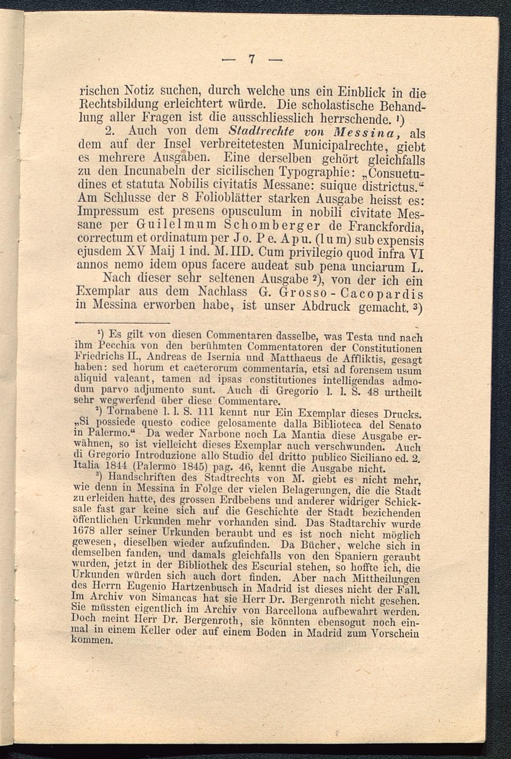 3 ) Handschriften des Stadtrechts von M. giebt es nicht mehr,wie denn in Messina in Folge der vielen Belagerungen, die die Stadtzu erleiden hatte, des grossen Erdbebens und anderer widriger Schick-sale fast gar keine sich auf die Geschichte der Stadt beziehendenöffentlichen Urkunden mehr vorhanden sind. Das Stadtarchiv wurde1078 aller seiner Urkunden beraubt und es ist noch nicht möglichgewesen, dieselben wieder aufzufinden. Da Bücher, welche sich indemselben fanden, und damals gleichfalls von den Spaniern geraubtwurden, jetzt in der Bibliothek des Escurial stehen, so hoffte ich, dieUrkunden würden sich auch dort finden. Aber nach Mittheilungendes Herrn Eugenio Hartzenbusch in Madrid ist dieses nicht der Fall.Im Archiv von Simancas hat sie Herr Dr. Bergenroth nicht gesehen.Sie müssten eigentlich im Archiv von Barcellona aufbewahrt werden.Doch meint Herr Dr. Bergenroth, sie könnten ebensogut noch ein-mal in einem Keller oder auf einem Boden in Madrid zum Vorscheinkommen.
