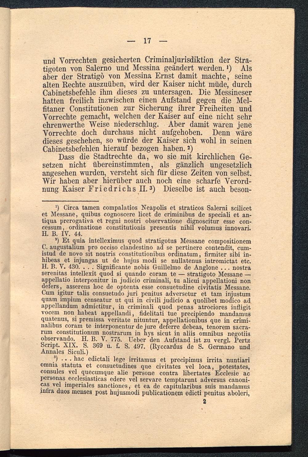 *) Et quia intelleximus quod stratigotus Messane compositionemC. augustalium pro occiso clandestino ad se pertinere contendit, cum-istud de novo sit nostris constitutionibus ordinatum, firmiter sibi in-hibeas et injungas ut de lmjus modi se nullatenus intromictat etc.II. B. V. 430. . . . Signiflcante nobis Guillelmo de Anglone ... nostraserenitas intellexit quod si quando coram te — stratigoto Messane —appellatio interponitur in judicio criminali, tu alicui appellationi nondefers, asserens hoc de optenta esse consuetudine civitatis Messane.Cum igitur talis consuetudo juri penitus adversetur et tarn injustumquam impium censeatur ut qui in civili judicio a quolibet moaico adappellandum admictitur, in criminali quod penas atrociores infligitvocem non habeat appellandi, fidelitati tue precipiendo mandamusquatenus, si premissa veritate nituntur, appellationibus que in crimi-nalibus coram te interponentur de jure deferre debeas, tenorem sacra-rum constitutionum nostrarum in hys sicut in aliis Omnibus negotiisobservando. H. B. V. 775. Ueber den Aufstand ist zu vergl. PertzScript. XIX. S. 369 u. f. S. 497. (Ryccardus de S. Germano undAnnales Siculi.)