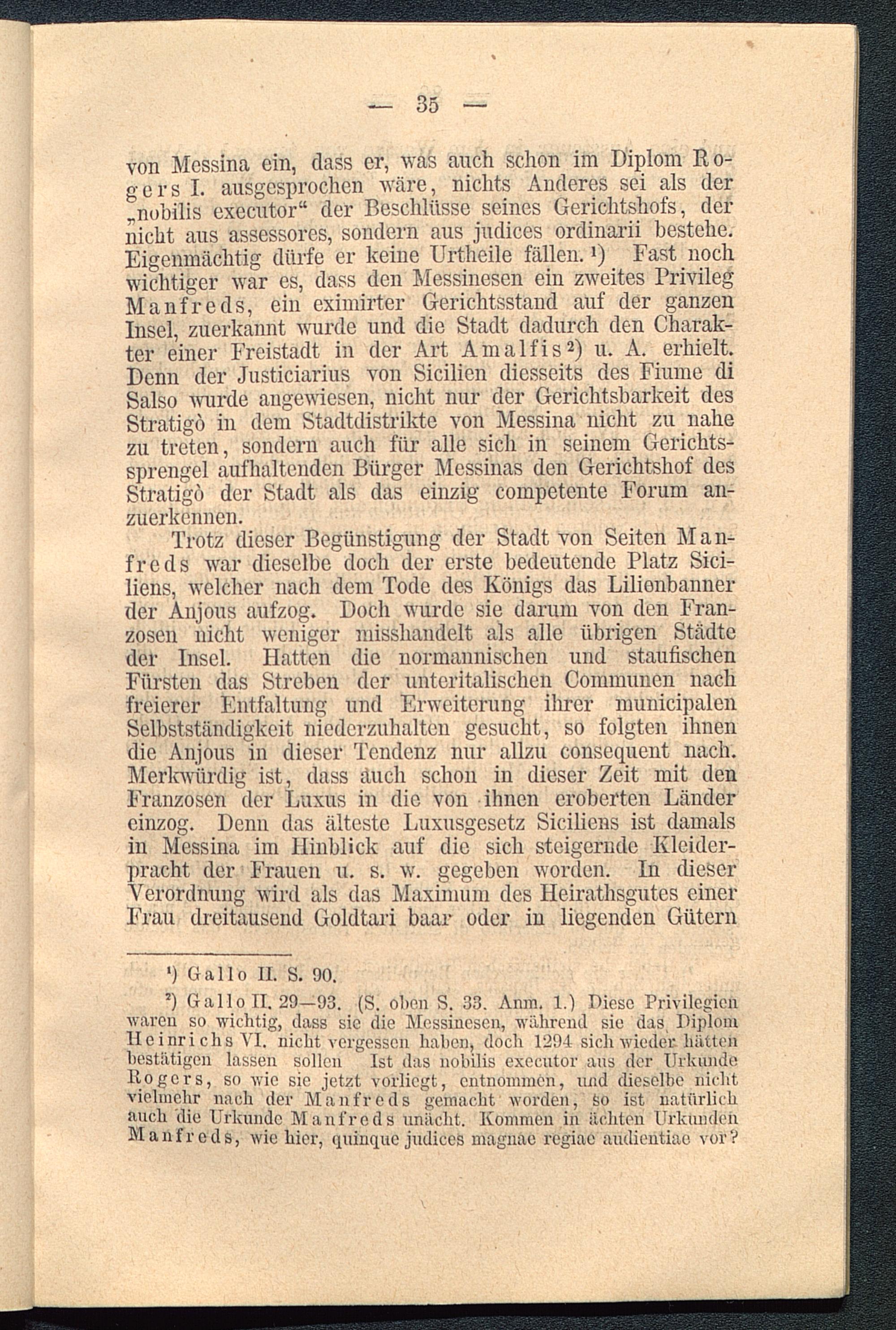 von Messina ein, dass er, was auch schon im Diplom Ro-gers I. ausgesprochen wäre, nichts Anderes sei als derr nobilis executor“ der Beschlüsse seines Gerichtshofs, dernicht aus assessores, sondern aus judices ordinarii bestehe.Eigenmächtig dürfe er keine Urtheile fällen. >) Fast nochwichtiger war es, dass den Messinesen ein zweites PrivilegManfreds, ein eximirter Gerichtsstand auf der ganzenInsel, zuerkannt wurde und die Stadt dadurch den Charak-ter einer Freistadt in der Art Amalfis 2 ) u. A. erhielt.Denn der Justiciarius von Sicilien diesseits des Fiume diSalso wurde angewiesen, nicht nur der Gerichtsbarkeit desStratigö in dem Stadtdistriktc von Messina nicht zu nahezu treten, sondern auch für alle sich in seinem Gerichts-sprengel aufhaltenden Bürger Messinas den Gerichtshof desStratigö der Stadt als das einzig competente Forum an-zuerkennen.