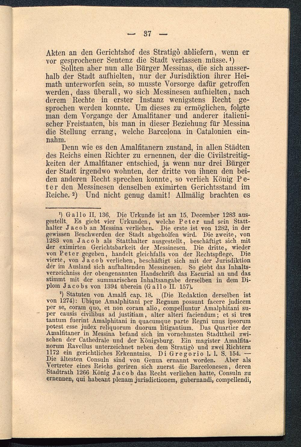 f estellt. Es giebt vier Urkunden, welche Peter und sein Statt-alter Jacob an Messina verliehen. Die erste ist von 1282, in dergewissen Beschwerden der Stadt abgebolfen wird. Die zweite, von1283 von Jacob als Statthalter ausgestellt, beschäftigt sich mitder eximirten Gerichtsbarkeit der Messinesen. Die dritte, wiedervon Peter gegeben, handelt gleichfalls von der Rechtspflege. Dievierte, von Jacob verliehen, beschäftigt sich mit der Jurisdiktionder im Ausland sich aufhaltenden Messinesen. So giebt das Inhalts-verzeichniss der obengenannten Handschrift das Escurial an und dasstimmt mit der summarischen Inhaltsangabe derselben in dem Di-plom Jacobs von 1394 überein (Gallo II. 157).